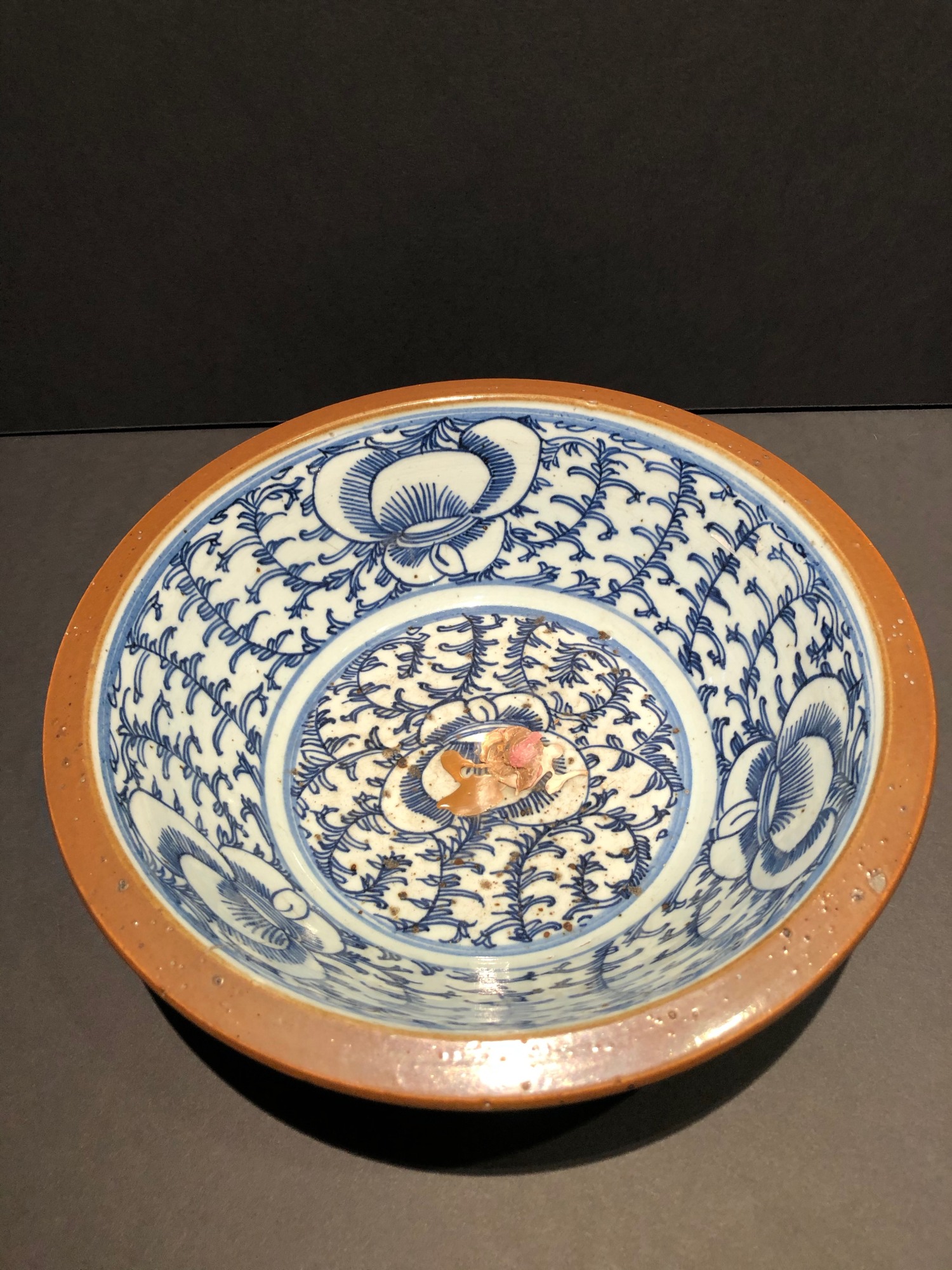 200 year old antique Chinese blue and white bowl with brown rim and sides. Wax seal stamp remains in bowl.