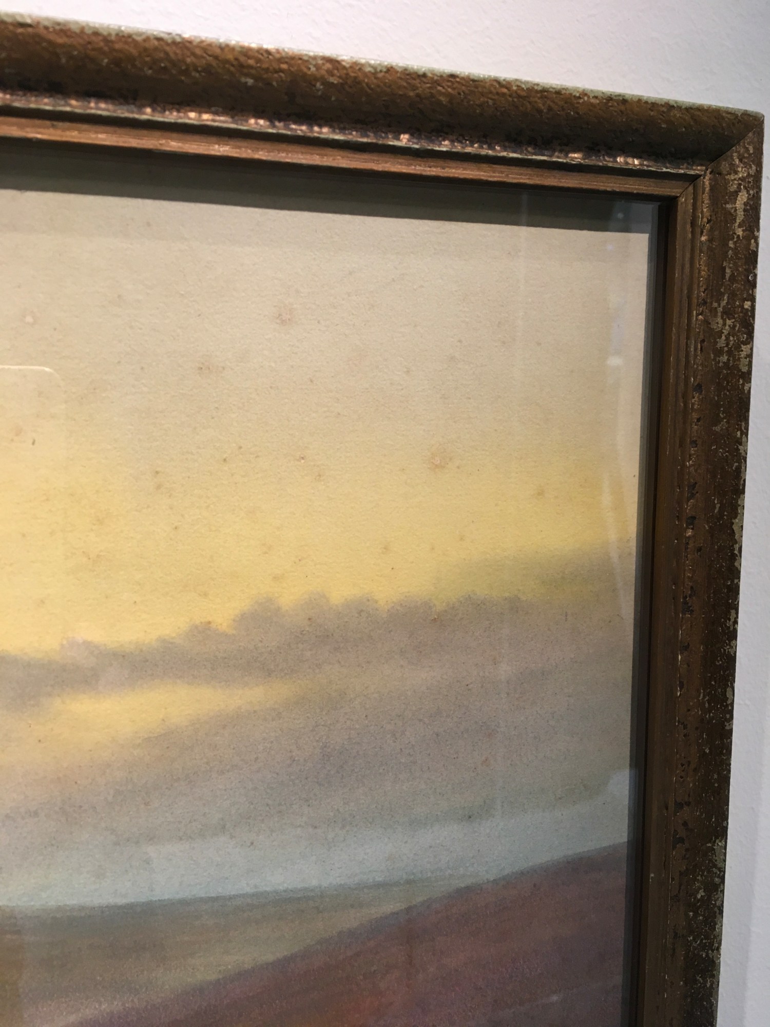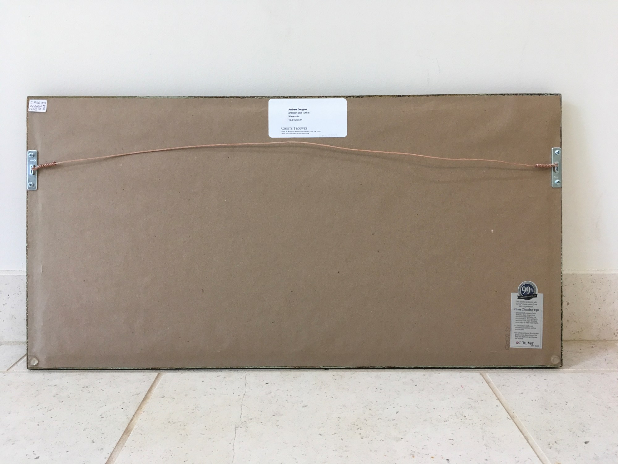 This late 19th century framed 14" x 27" watercolor painting by artist Andrew Douglas depicts an ominous landscape in a dark and neutral palette of browns, gray, and yellow. In the foreground of the image is the opening of a pathway that leads through the hillside. In the distance is a large structure with a watchtower, in the background the evening dusk is enveloped by the moving clouds.