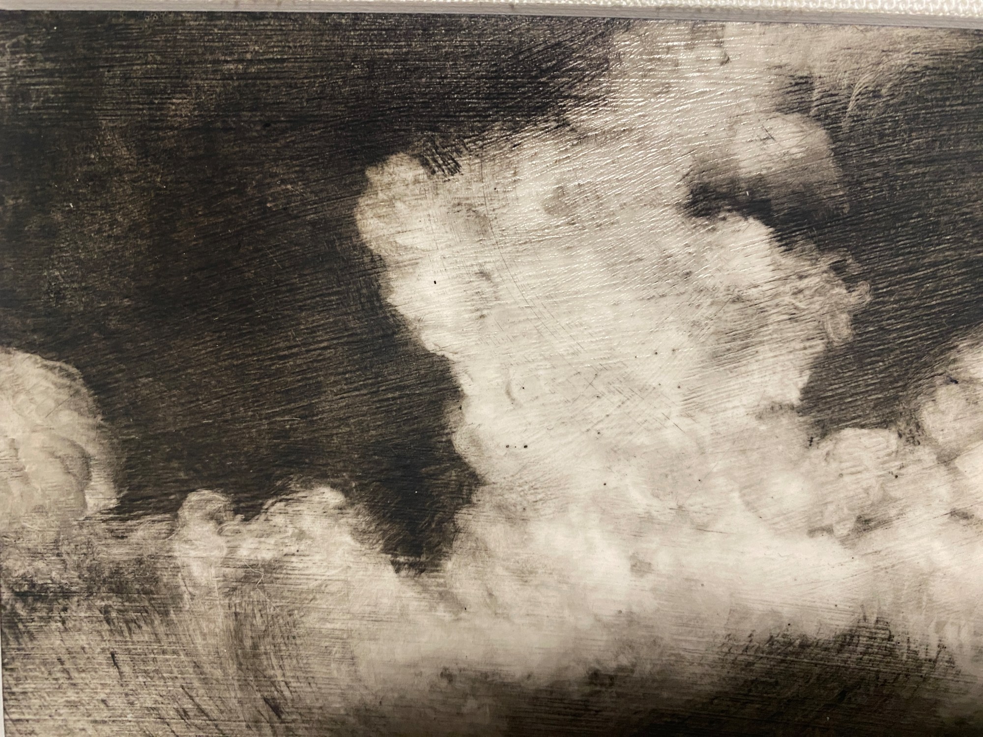 Although this work is the size of a study for a larger painting, it is a stand-alone intimate work referencing the awe and wonderment I experience through cloud-filled days and nights. It is not based on photographic reference, rather it is an emotive cloudscape and an optical carrier of impermanence and flux.