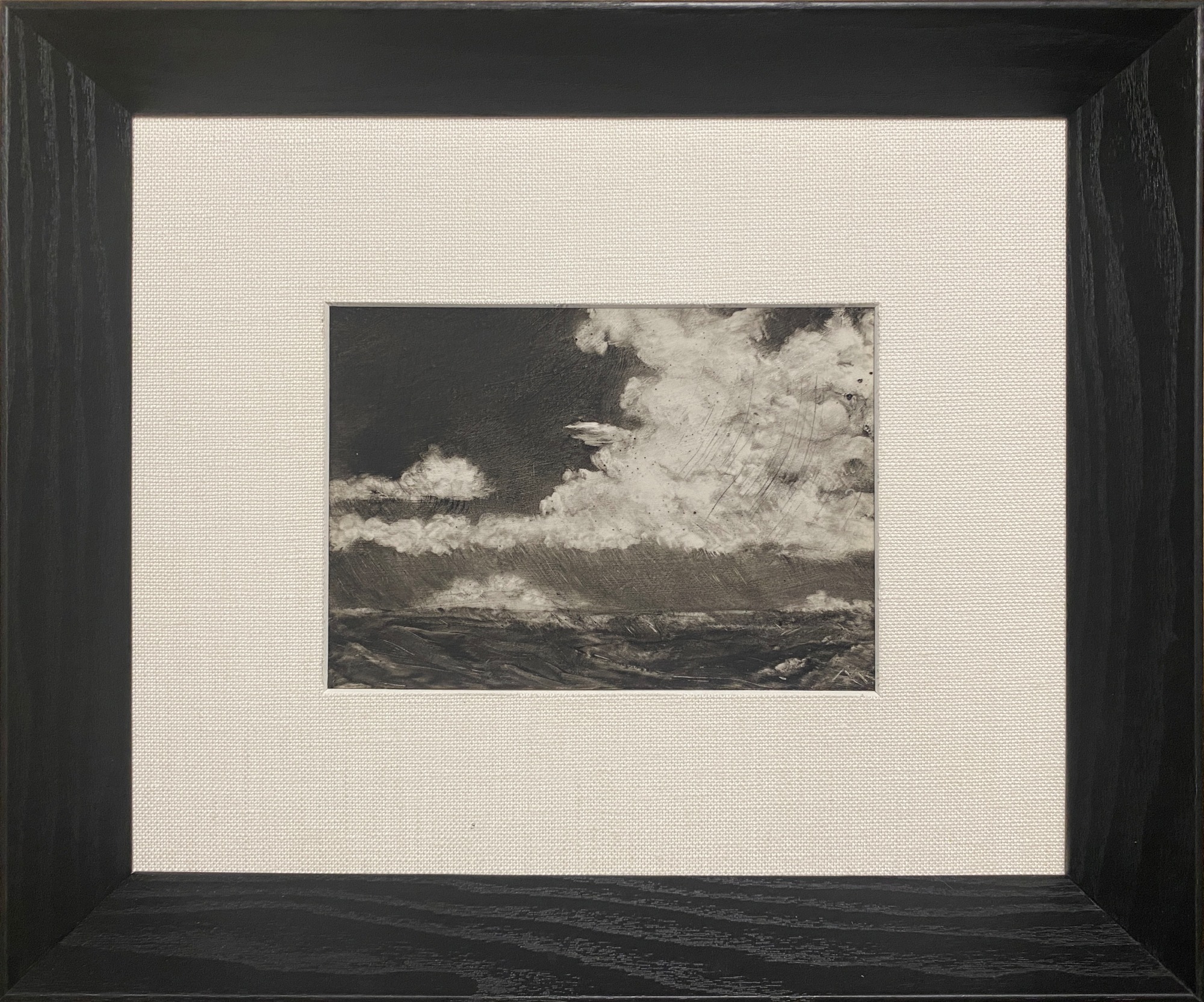Although this work is the size of a study for a larger painting, it is a stand-alone intimate work referencing the awe and wonderment I experience through cloud-filled days and nights. It is not based on photographic reference, rather it is an emotive cloudscape and an optical carrier of impermanence and flux.