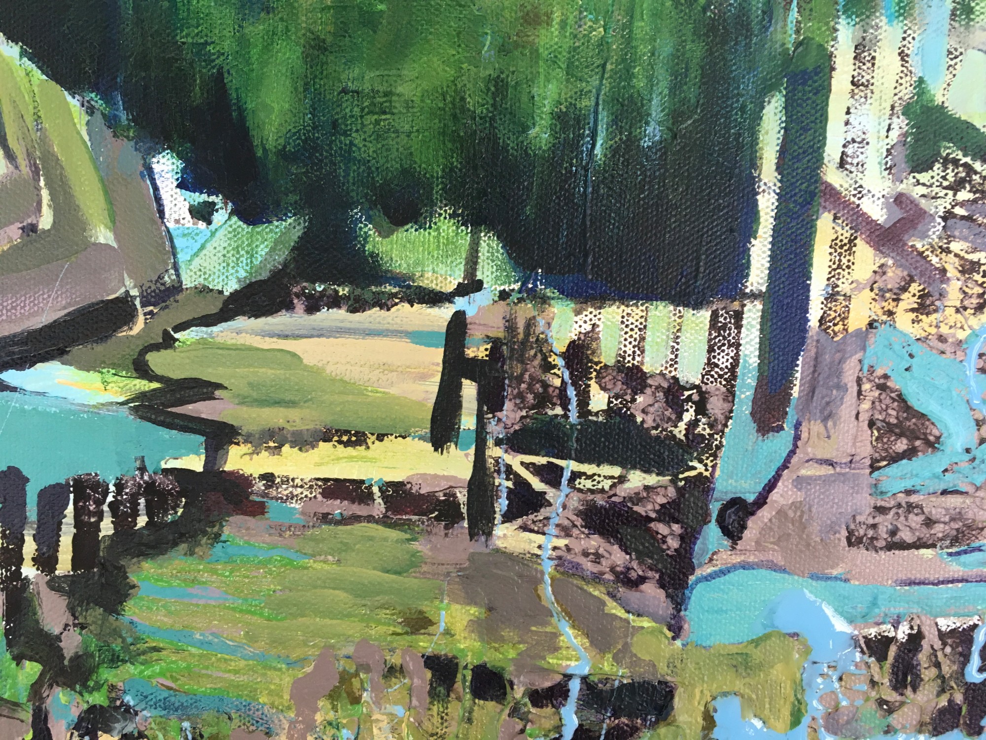 "In this painting I continue my exploration of themes of nature and architecture. The receding landscape can be seen in the lefthand corner. Architecture is enveloped by water. Structures are submerged. The effect of climate change is devastating to our planet. This painting speaks to my concern with the devastation caused by climate change." - Janice Tayler