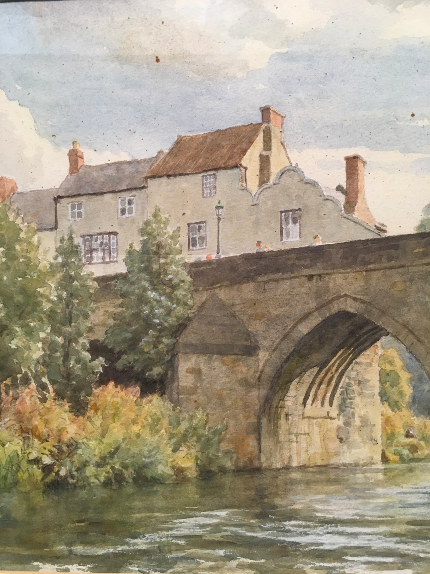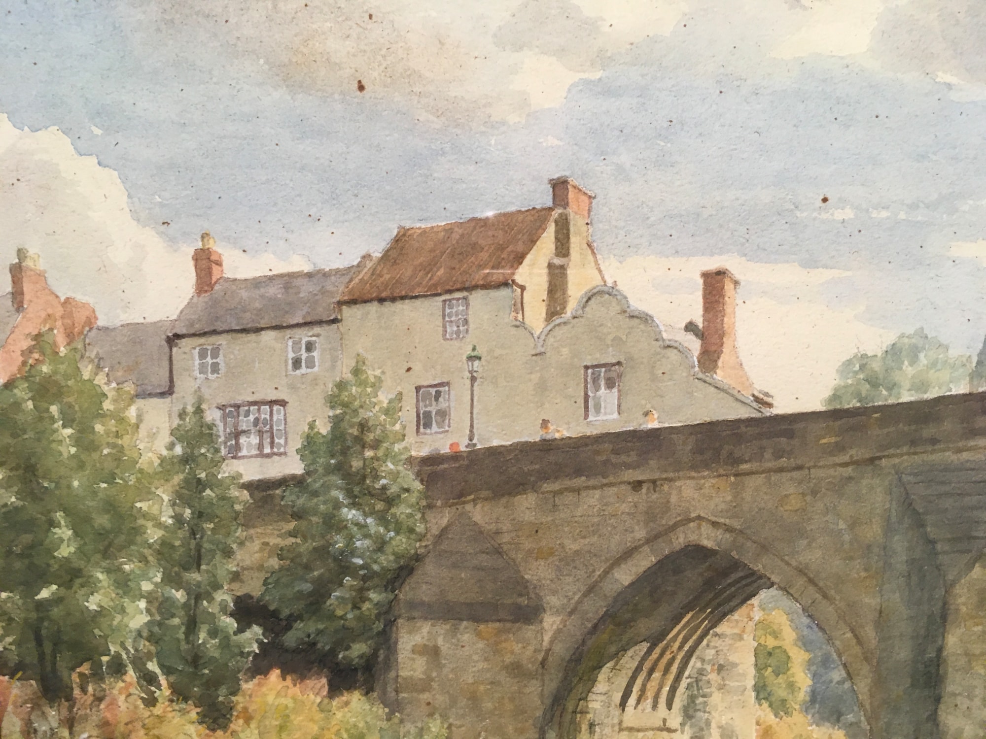 This framed and matted 17" x 20.75" watercolor painting by Hubert John Williams depicts a stone bridge over a river. On the left side of the bridge is green foliage along the river's edge. In the distance, several rooftops and chimneys are visible. In the lower mid-section of the painting are two boats in the river with passengers. The painting is in a neutral palette of gray, browns, greens, and yellow tones.