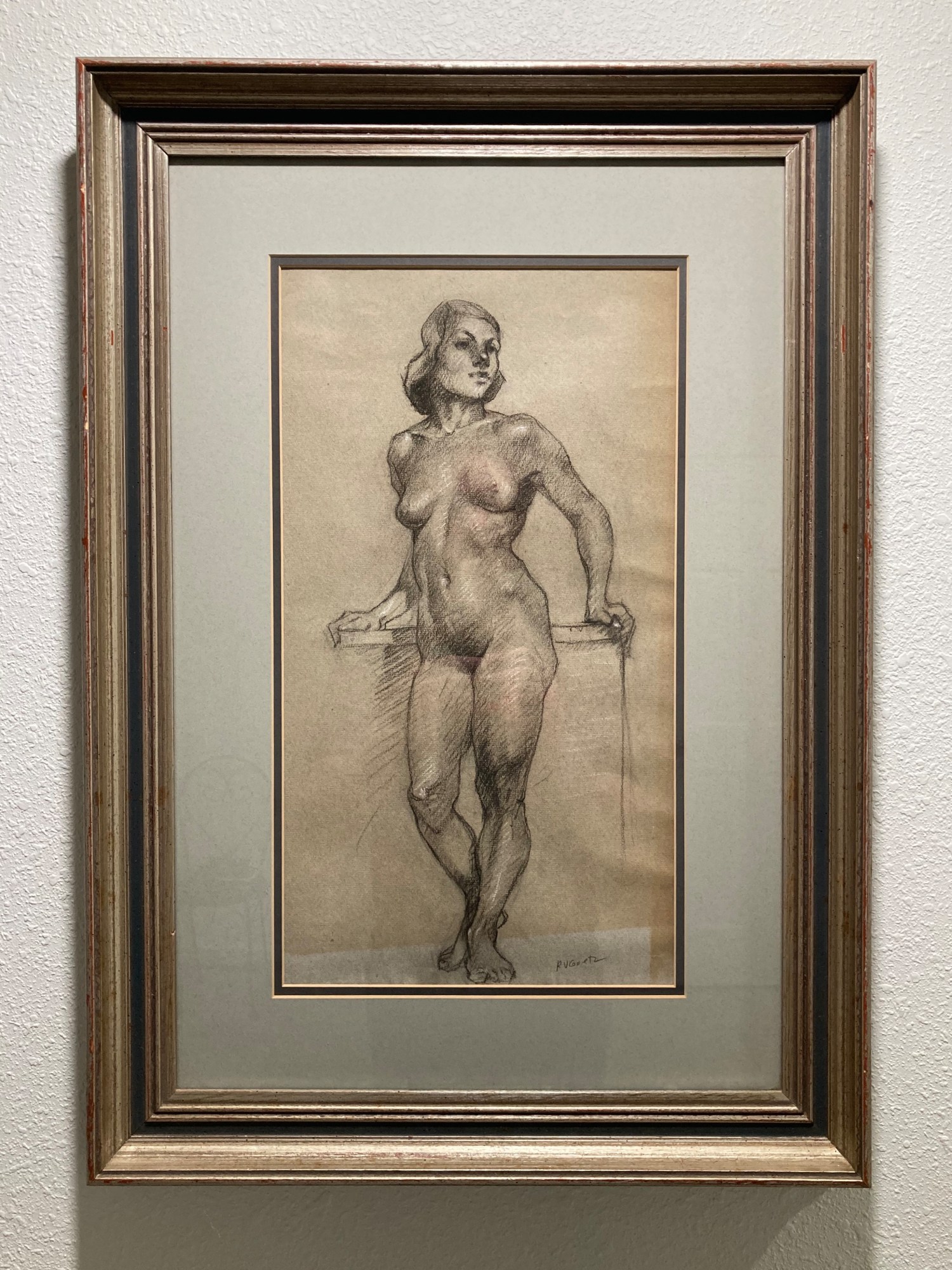 This Richard Vernon Goetz Drawing on Paper from the mid-20th Century features a standing female nude rendered in black and grey cross-hatch lines of Charcoal and Conté Crayon.