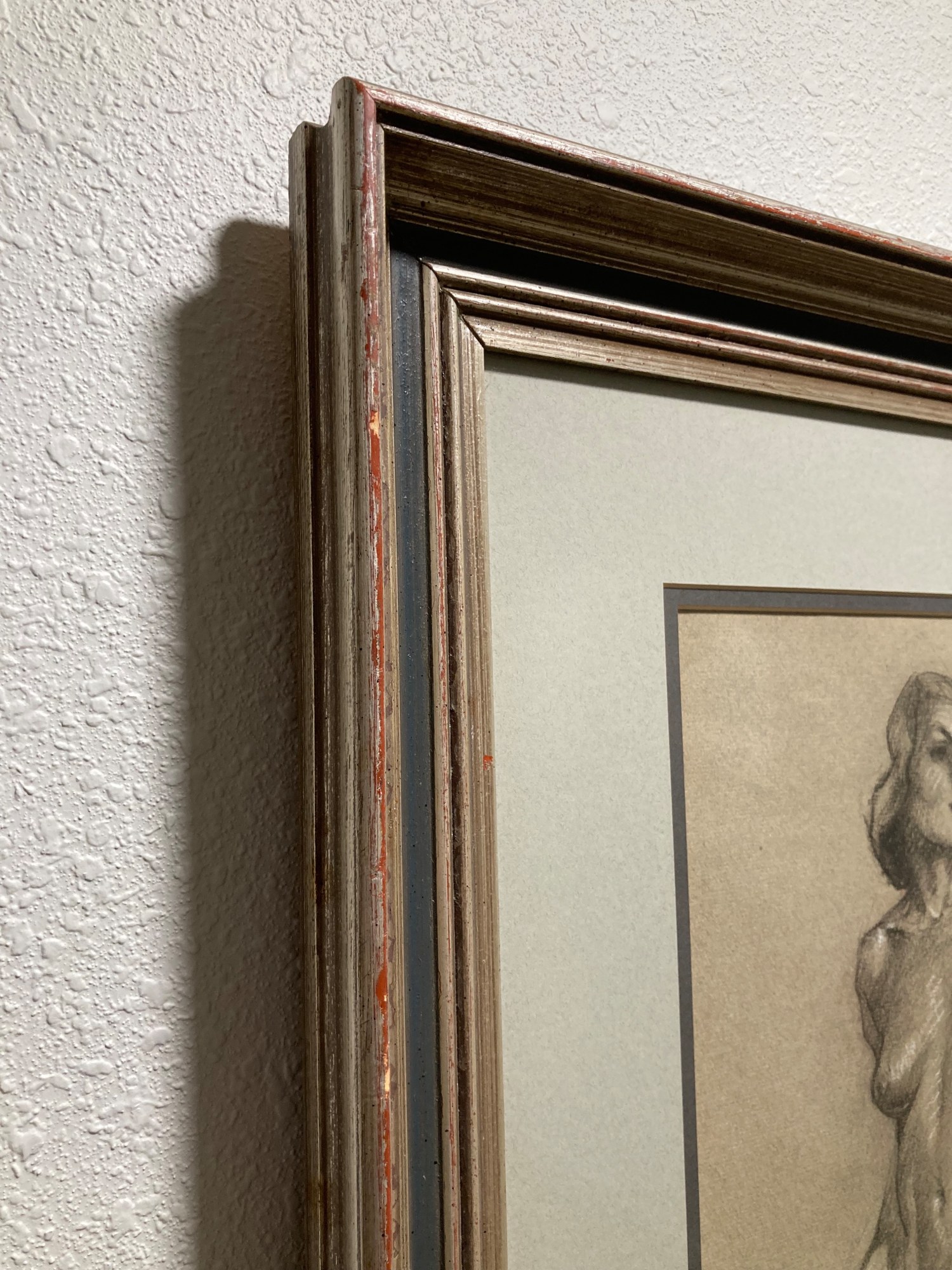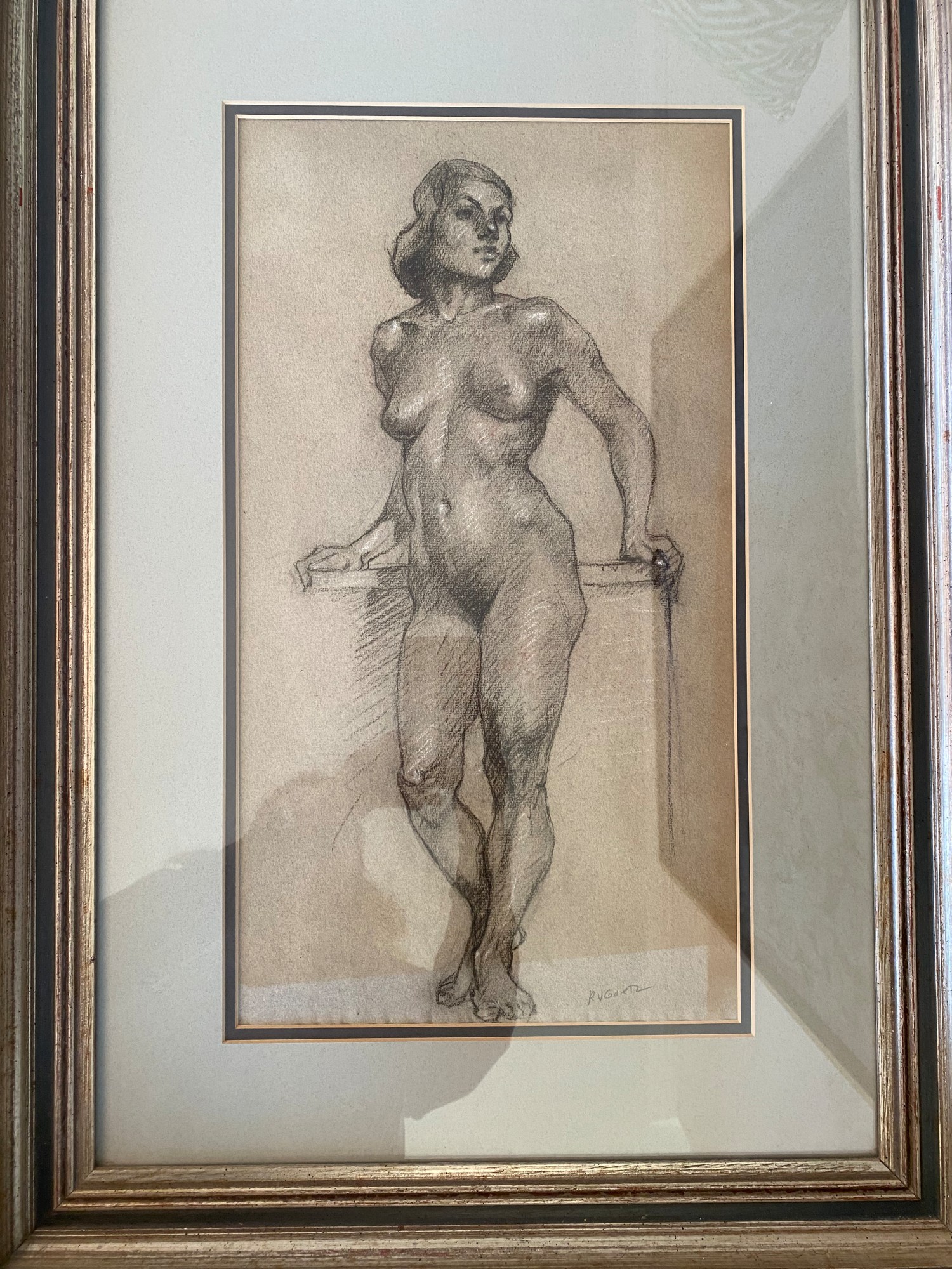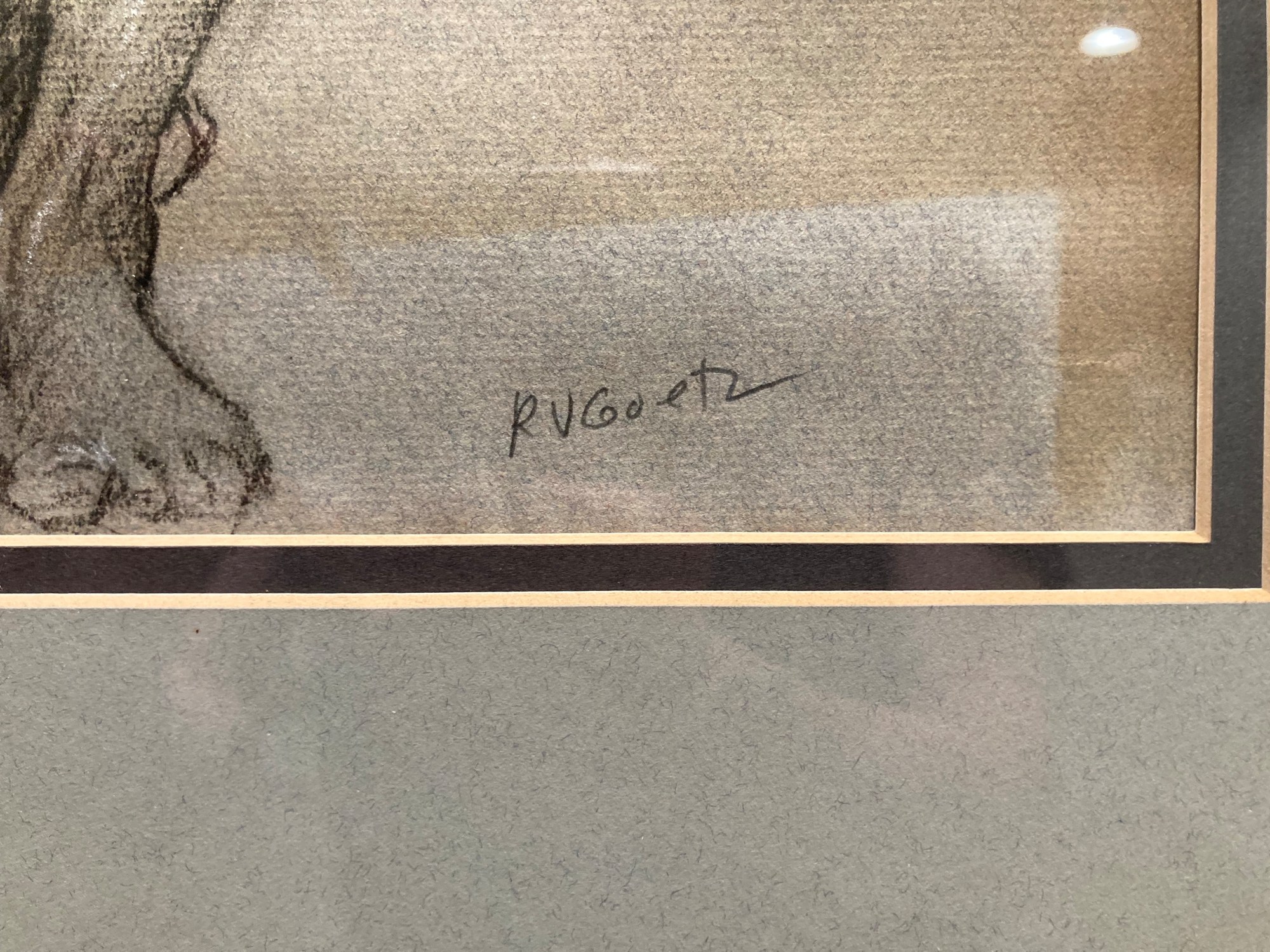 The drawing is matted and framed in a wooden frame.