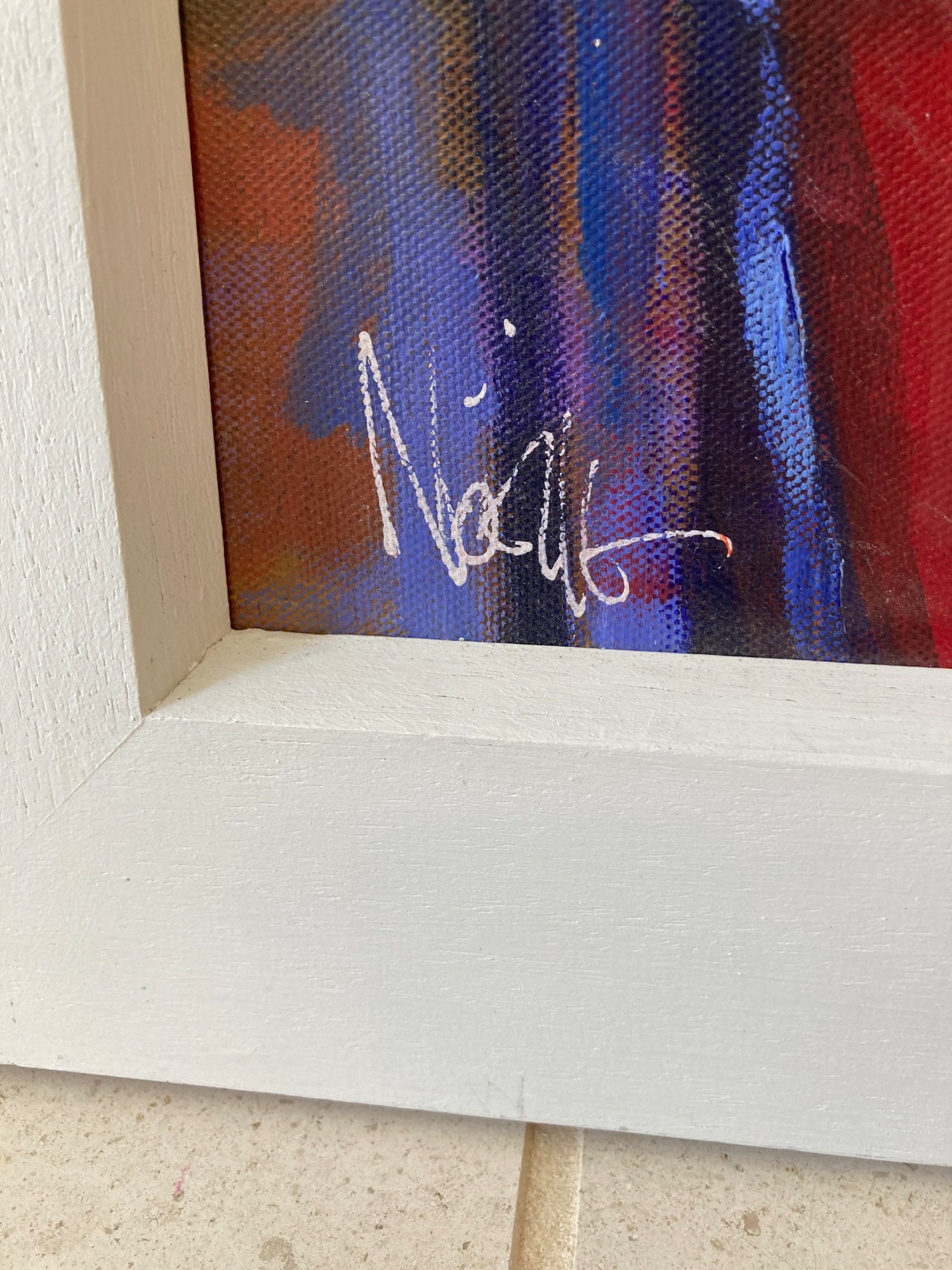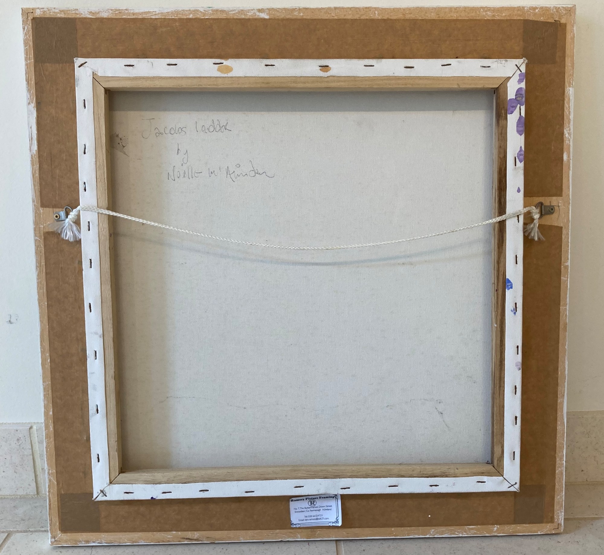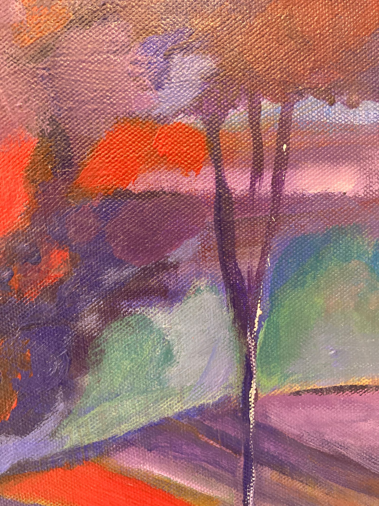 In this framed 24.8" x 24.8"acrylic on linen painting by Northern Irish artist, Noelle McAlinden, an imaginary landscape emerges with the suggestion of trees and Jacobs Ladder ascending. The palette is deep purples, reds and blues with touches of white highlighting the trees and ladder. The artist states that this painting is "reminiscent of reflections on happy times with loved ones now gone." The painting is framed in a white beveled wooden frame.