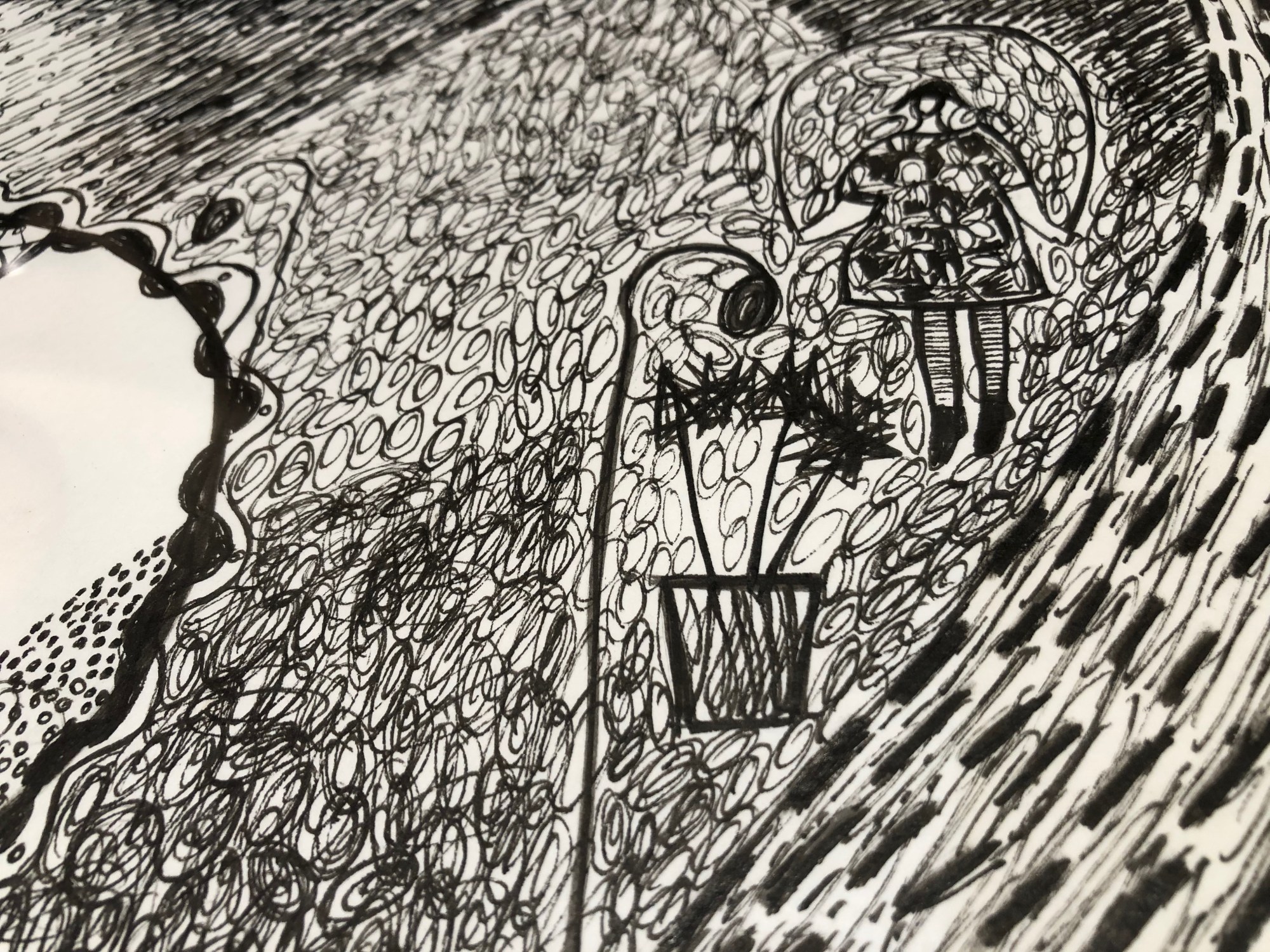 'les femmes du samedi #5,' black and white ink drawing on paper by Josette Simon-Gestin.
