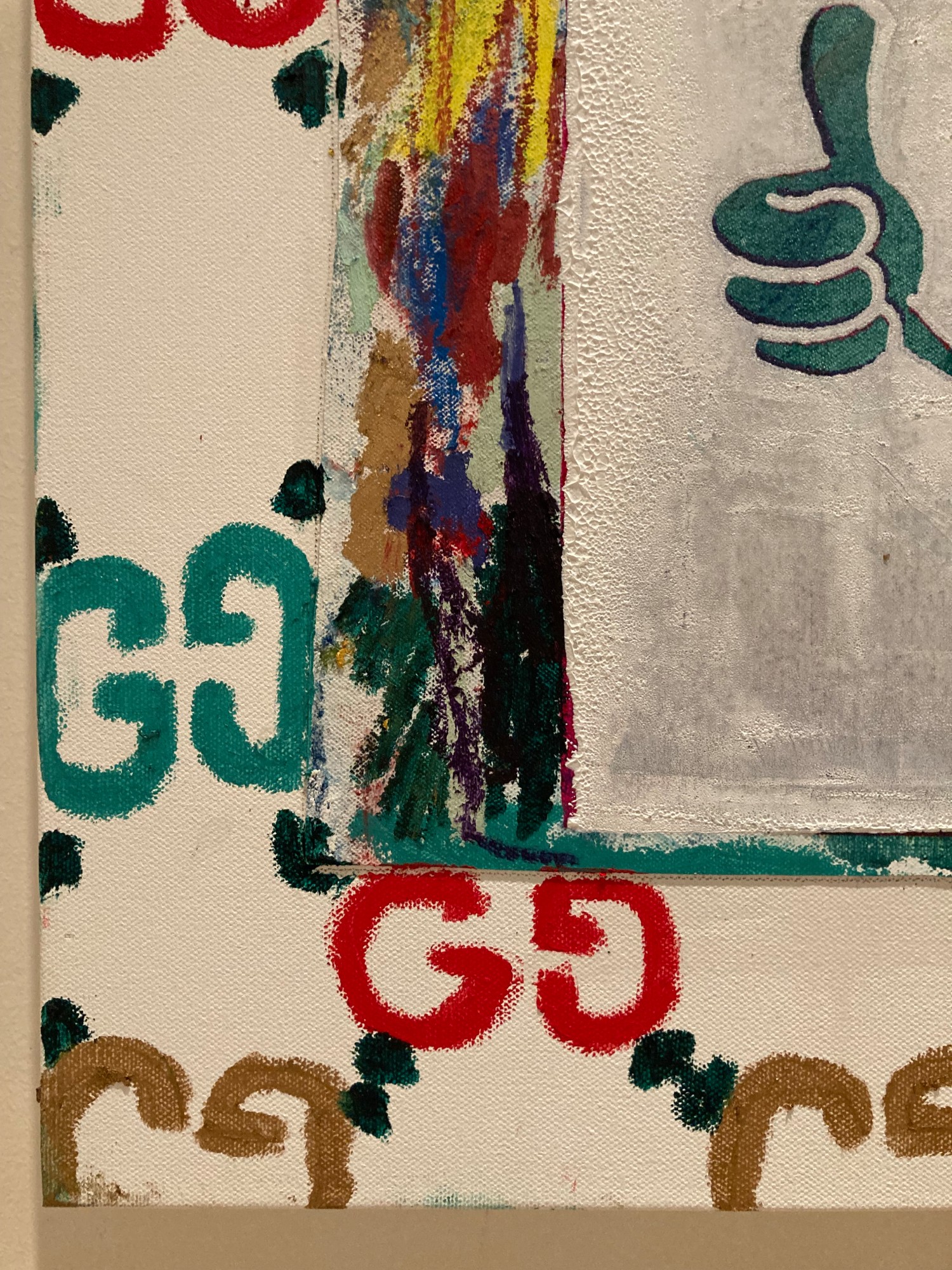 In this mixed media 24"x24" painting by XVALA, the artist colorfully plays with the 'Gucci' brand in tandem with the childhood cartoon series, 'Spongebob.' A 'Goochi Sponge' takes center stage with a play on the 'Gucci' logo as the canvas background. Predominant colors are green, red, and gold on a white background.