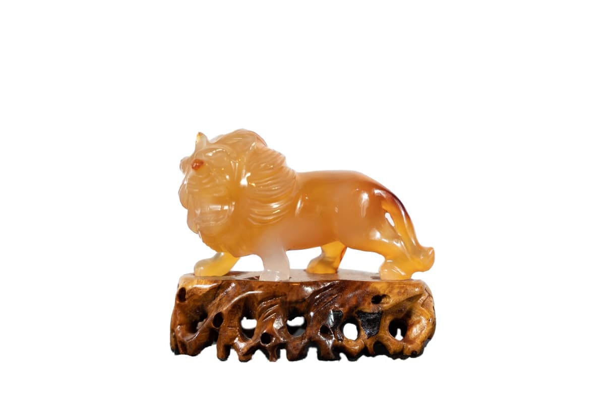 Miniature hand carved Chinese carnelian lion with matching hand carved wooden base