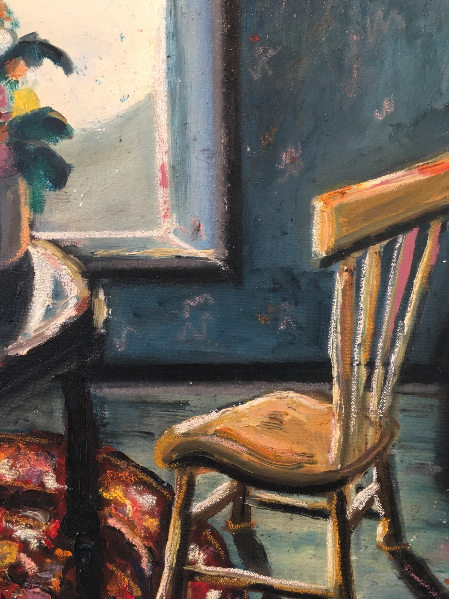 The focal point of the work seems to be the light colored chair that takes up the middle area of the composition. The chair is facing the 3-paned window that takes up the majority of the wall seen in the background. The window has bright light coming in from it, highlighting the chair that sits in front of it and casting a dark shadow behind it. Next to the window on the right, is a depiction of a hanging piece, which looks to be an abstract representation. The other wall meets the corner perpendicularly, just to the right of the hanging artwork. Against this wall is a trunk with a rounded top, decorated with red and yellow vertical stripes that are also highlighted from the light coming in from the window. One leg of the chair, the front left, is on top of a rug while the others are set on the blue/grey floor. The rug is round and appears to be ornate with detail; however, the artist's style makes the ornamentation ambiguous, almost like an abstract representation of various colors, in this case: reds, yellows, oranges, and browns. Only a portion of the rug is visible, as the rest is cut off by the canvas, and it takes up the bottom left corner of the work. There is a table that is also cut off by the left hand side of the canvas and is positioned on top of the ornate rug. Only a small portion of the table is visible and on top of the table is a vase of flowers, represented again, in a painterly way and depicting mainly white, yellow, and pink blossoms with a few dark green leaves. Green leaves are also slightly seen through the window, but painted with a lighter color of green. The light from the window is reflected on the surface of the table and makes it appear shiny, like the table is lacquered. This adds to the slight realistic representation, yet still adheres to the overall impressionistic qualities by incorporating the nonobjective flowers and the unfinished look of the chair besides it. The artist utilized a somewhat limited color palette, mainly using a dark blueish/gray color while including hints of red, yellow, pink, orange, and white within the work on the wall, the rug, the flowers, and the trunk. The colors work well together, with the warmer colors complimenting the darker muted blue that takes up the majority of the work. The work itself is calm, yet almost mysterious as the chair is not facing the audience, creating a disconnect from the room and the viewer but encouraging more contemplation from the observer.