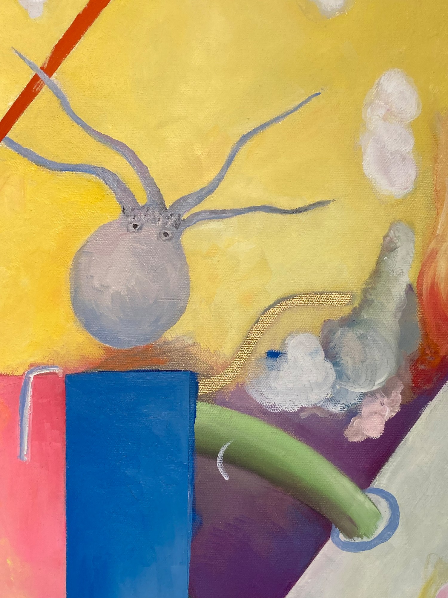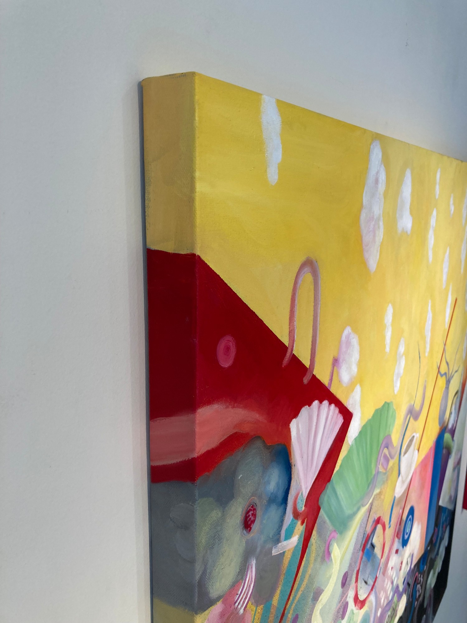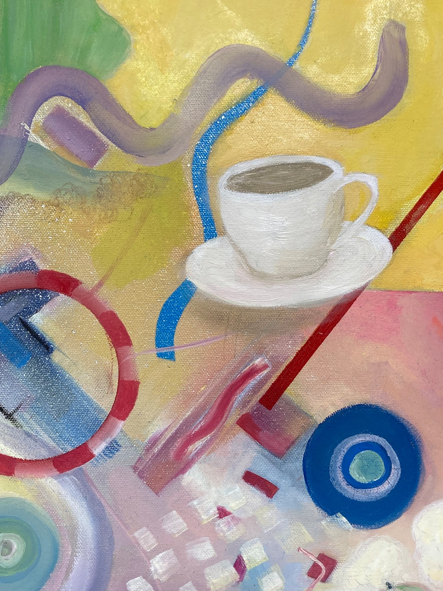 This 40" x 40" acrylic on canvas painting by Dragana Milovic depicts a fantastical landscape featuring objects the artist encounters through her everyday environment. In a palette of yellow, blue, pinks, and purple. "In this painting, I created a composition with various elements that surround me every day, such as clouds, sky and objects from everyday use - a cup of coffee, and geometric shapes that are also present every day. By combining all of these elements on the painting, I tried to achieve the rhythmicity and exhilaration of the composition."--Dragana Milovic