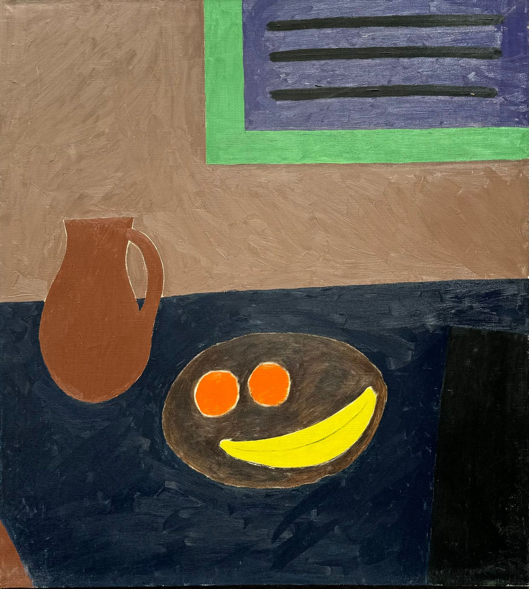 This 31" x 28" work was painted by Robert Bonaparte in 1980. The painting depicts an abstracted and minimalist still life composition on a canvas. In the foreground, there’s a dark blue table. On this table, a dark brown plate presumably holds two round oranges and a curved yellow. Adjacent to the plate, a brown jug with a handle stands. The background behind the presumed table is divided into different colored sections: green and purple with four horizontal black lines on the upper right side of the canvas and the rest of the background is a light brown color. The bold colors and simple shapes lend the abstract quality to this artwork.