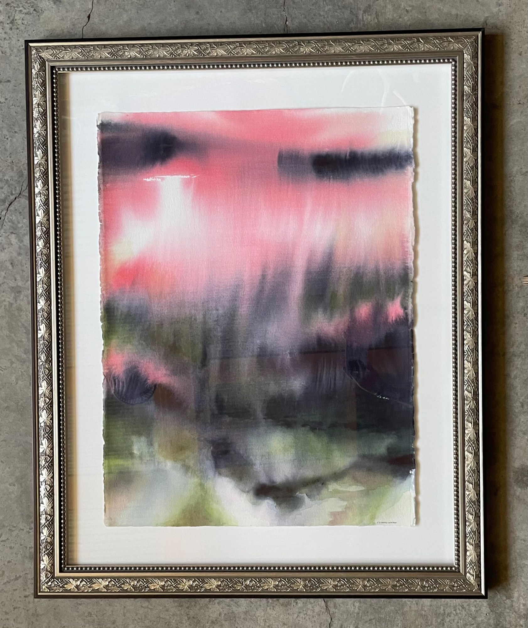 This painting is a wet-into-wet watercolor. It captures the reflective qualities of the water as the light hits the surface of the red lake.