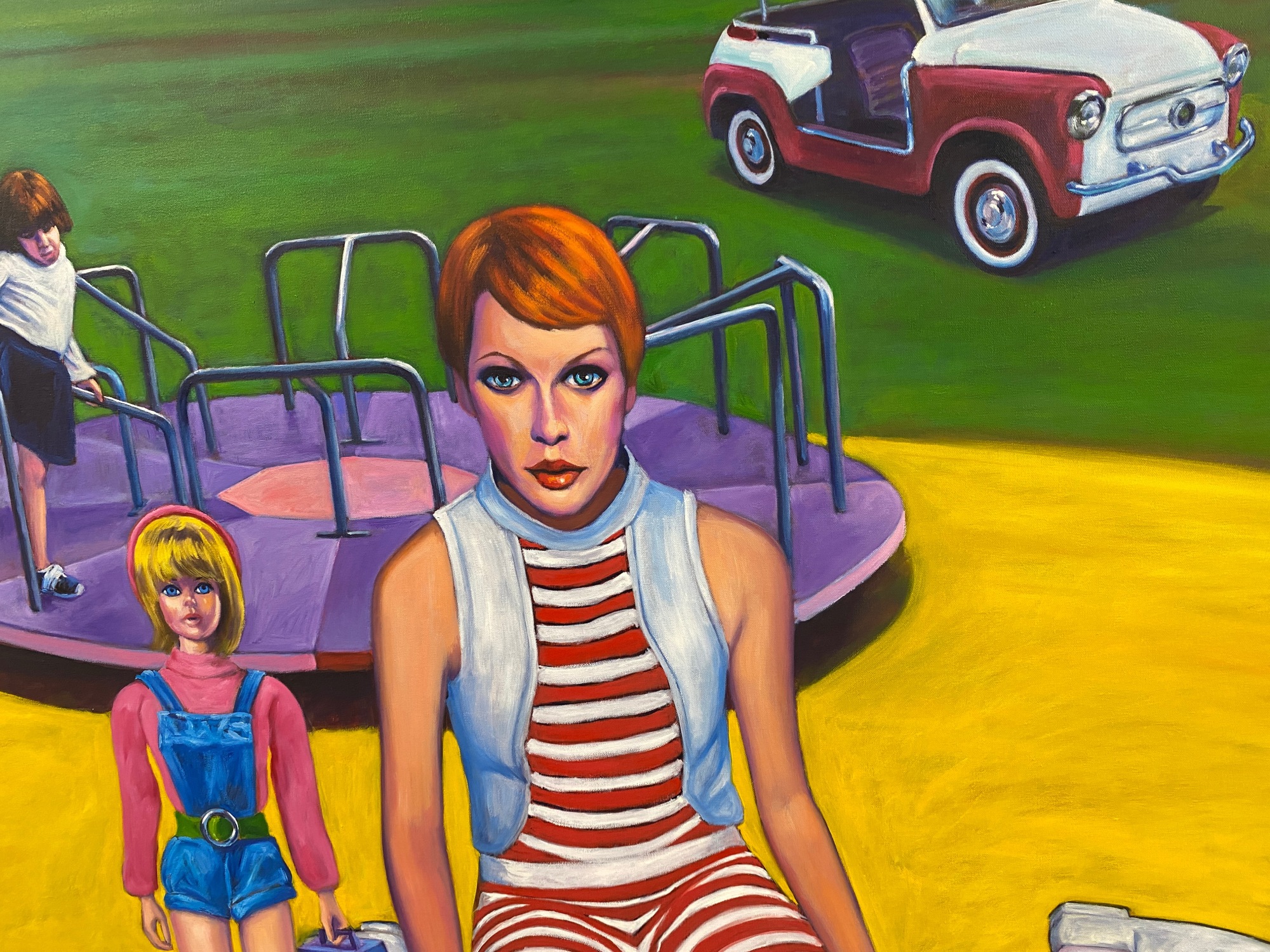 A little girl on a merry-go-round with a 1960's modern woman and walking doll in an Oklahoma landscape.