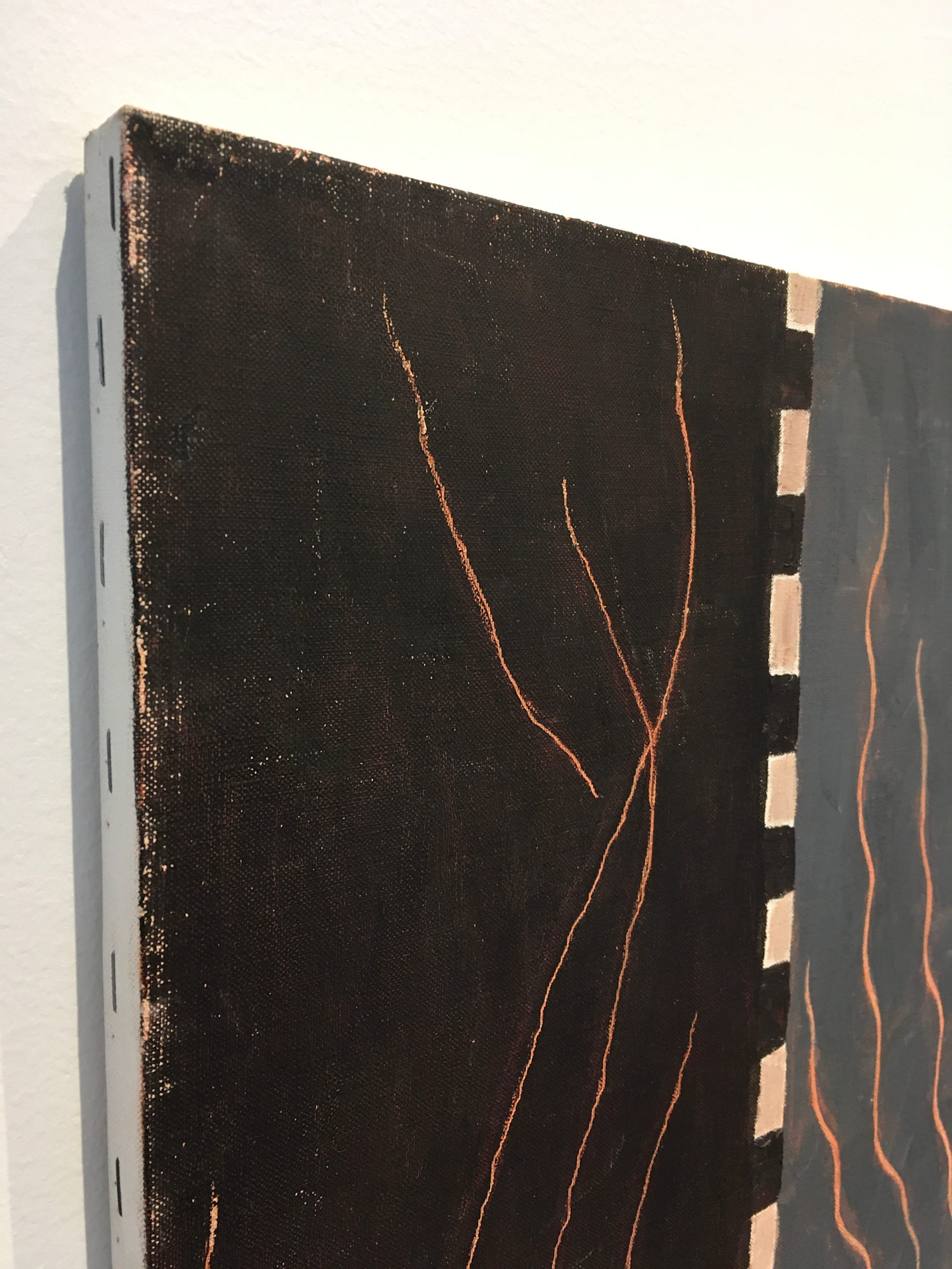 This 25 inch x 24 inch painting is an acrylic on linen abstract work painted by Robert Bonaparte. Done in a minimalist style, Bonaparte utilizes a limited color palette and incorporates a small amount of detail and subject matter. The composition is split up into four different rectangular sections, each determined by color, line, and pattern. The largest section is centrally positioned; the top of this section meets the top of the canvas, while the three other smaller sections border this larger area on the left, right, and bottom. In this section, there are various ambiguous shapes and forms, two of which are enclosed and painted with a solid color. One of these shapes is a dark orange color with vertical wavy lines of lighter orange, and is an unrecognizable form but somewhat similar to that of a banana or an elongated football. The other enclosed shape could also be considered representative of a banana, although the shape bends at a harder angle, somewhat correlating to a boomerang shape; this shape also has vertical wavy lines, in a lighter yellow color than the yellow that fills the shape. The other details present in this section of the work are not enclosed shapes but rather lines that form some sort of indiscernible pattern, painted with a light pinkish color upon the solid light grey background that fills the section. The vertically oriented section to the left of the work is separated by a very thin vertical strip that starts at the top edge of the work and ends right at the top of the bottom section; the thin strip is made up of alternating sections of black and white paint, creating a stripe pattern. The section on the left that is separated by this thin strip, is painted black, with the inclusion of various pink thin lines similar to the ones in the larger section as well as one solid, enclosed shape. The majority of the lines are long, vertical and organically curved, and two leaf-like shapes are made up of smaller lines, positioned close to the bottom edge of the section. The enclosed shape is yet again ambiguous and emerges from the left hand side of the composition; it is elongated and painted with a solid purple color. Below this, and also below the larger grey section, is a smaller horizontally oriented section that aligns the bottom edge of the work. This rectangular area is also painted black and includes a more symmetrical arrangement of pinkish toned lines that form a pattern of upside down and right side up triangles that vary in sizes and are positioned within each other. The last section vertically aligns with the right edge of the composition and takes up roughly a sixth of the canvas, reaching from the top of the work to the bottom. This section is light brown and has vertical zigzag lines that fill it, as well as five yellow diamonds that are not equally spaced together. Overall, the work utilizes a minimalist, abstract approach in subject matter and color, and ignores realistic and representational aspects.