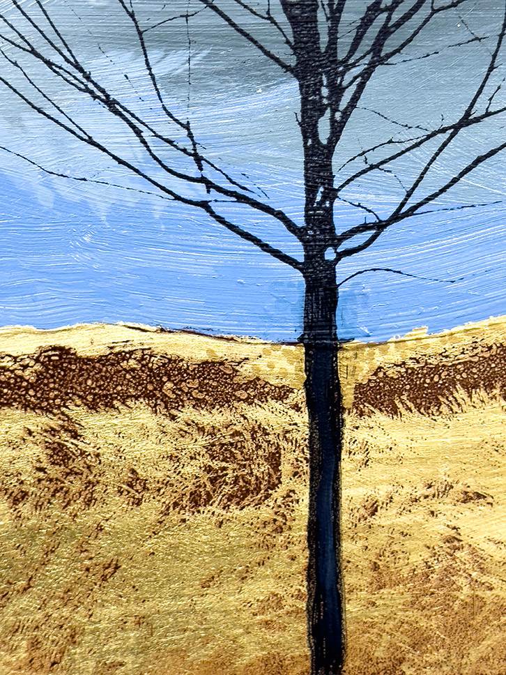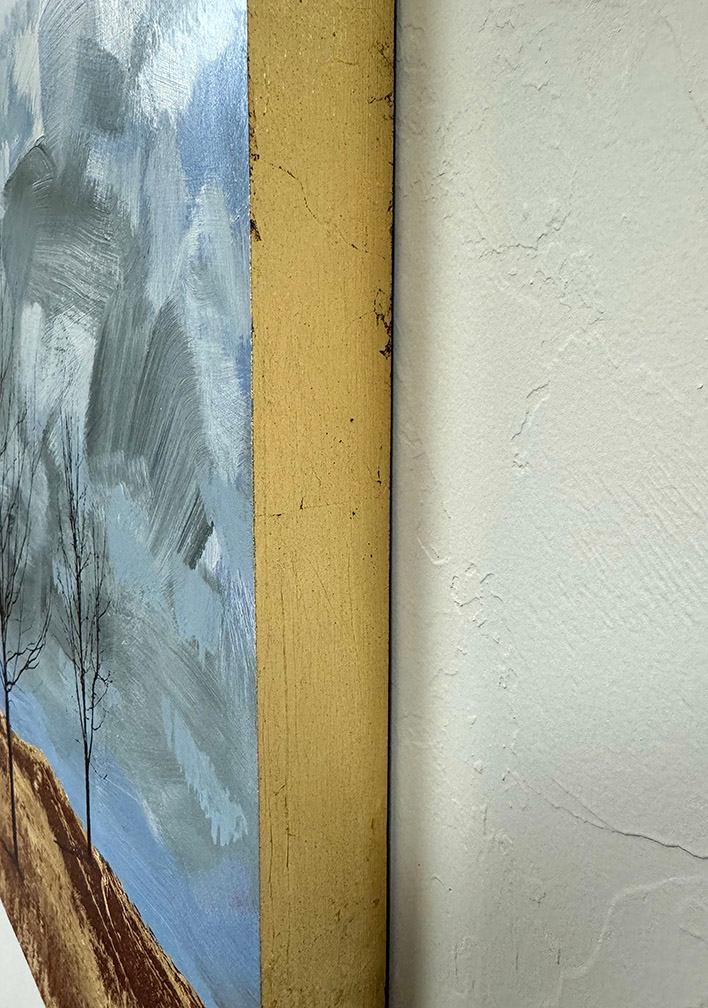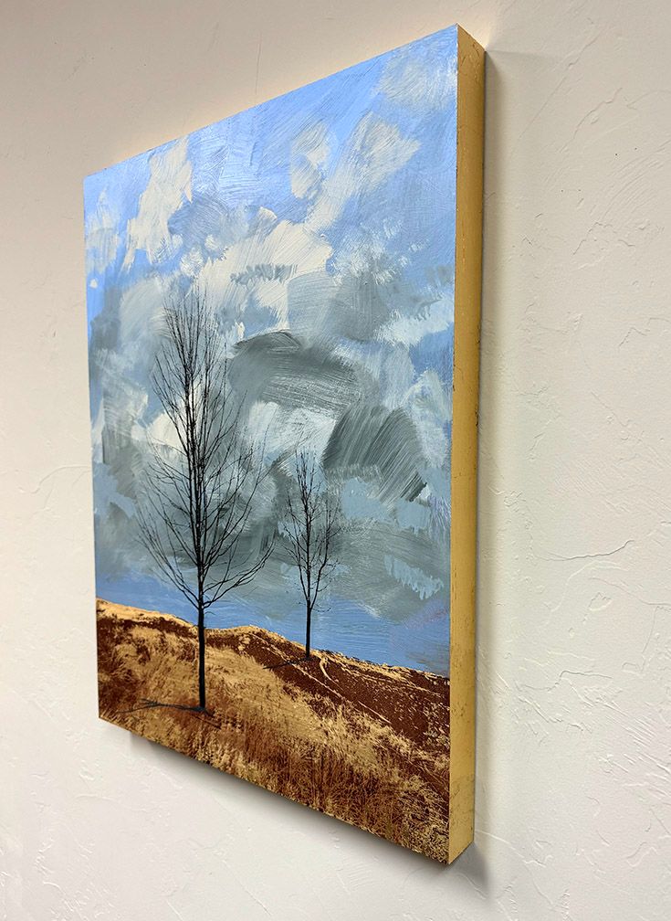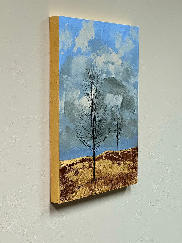 "Silent Guardians" is a captivating piece measuring 18"x24", crafted using acrylic and gold leaf on panel. The artwork presents a minimalist landscape featuring two leafless trees against an expansive sky. The trees stand in a gently sloping field of golden-brown grass, where gold leaf accents enhance the natural texture, adding a luminous quality to the foreground.