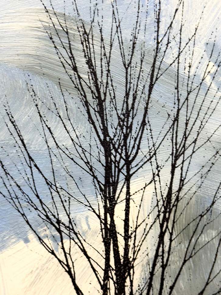 The sky is painted with broad, expressive strokes of white and gray clouds, set against a soft blue background. This creates an impressive sense of depth and movement, adding dynamic contrast to the stark, solitary trees. The balanced composition emphasizes the dramatic interplay between the barren trees and the vast, vivid sky, resulting in a striking and serene scene.