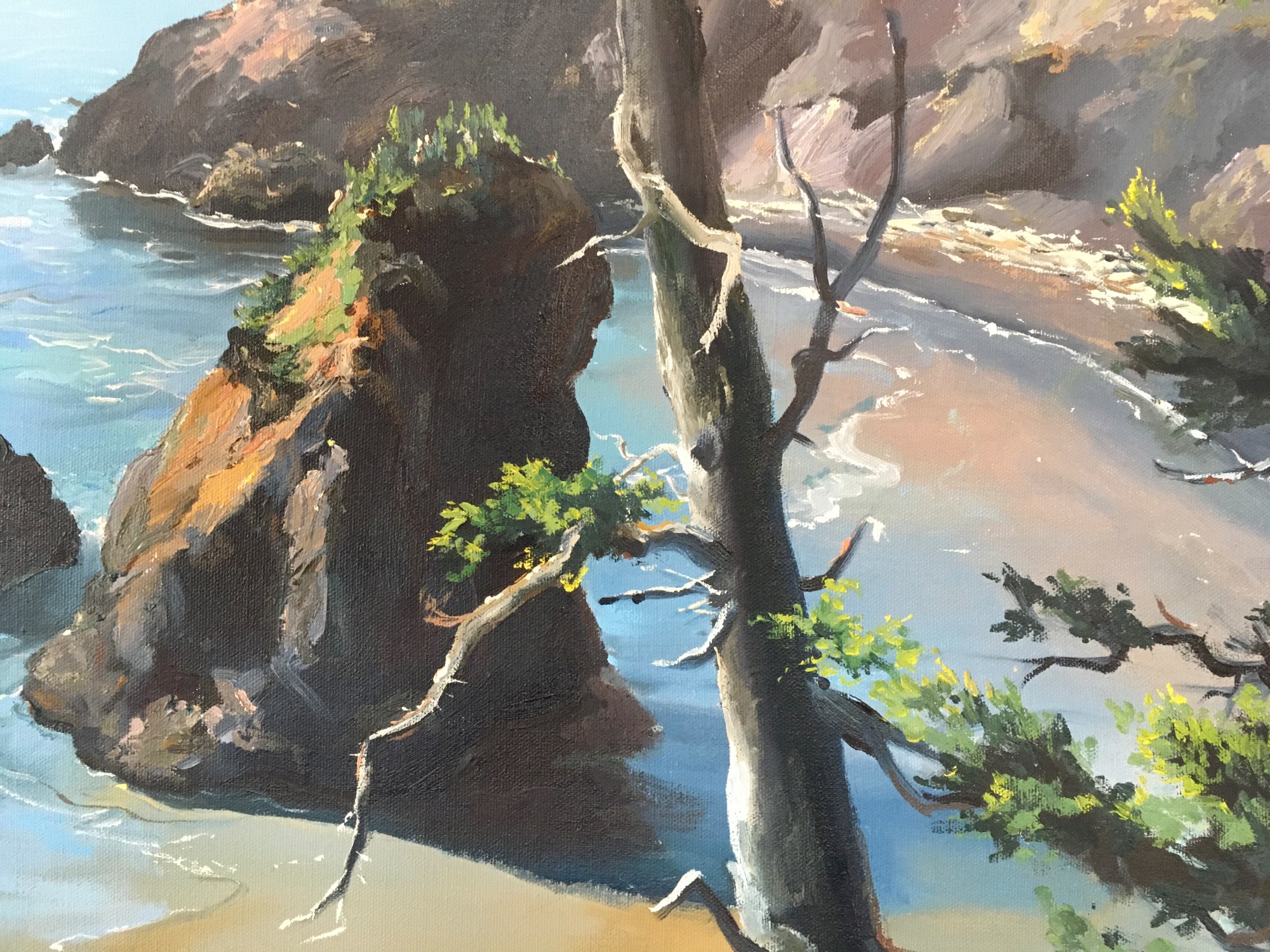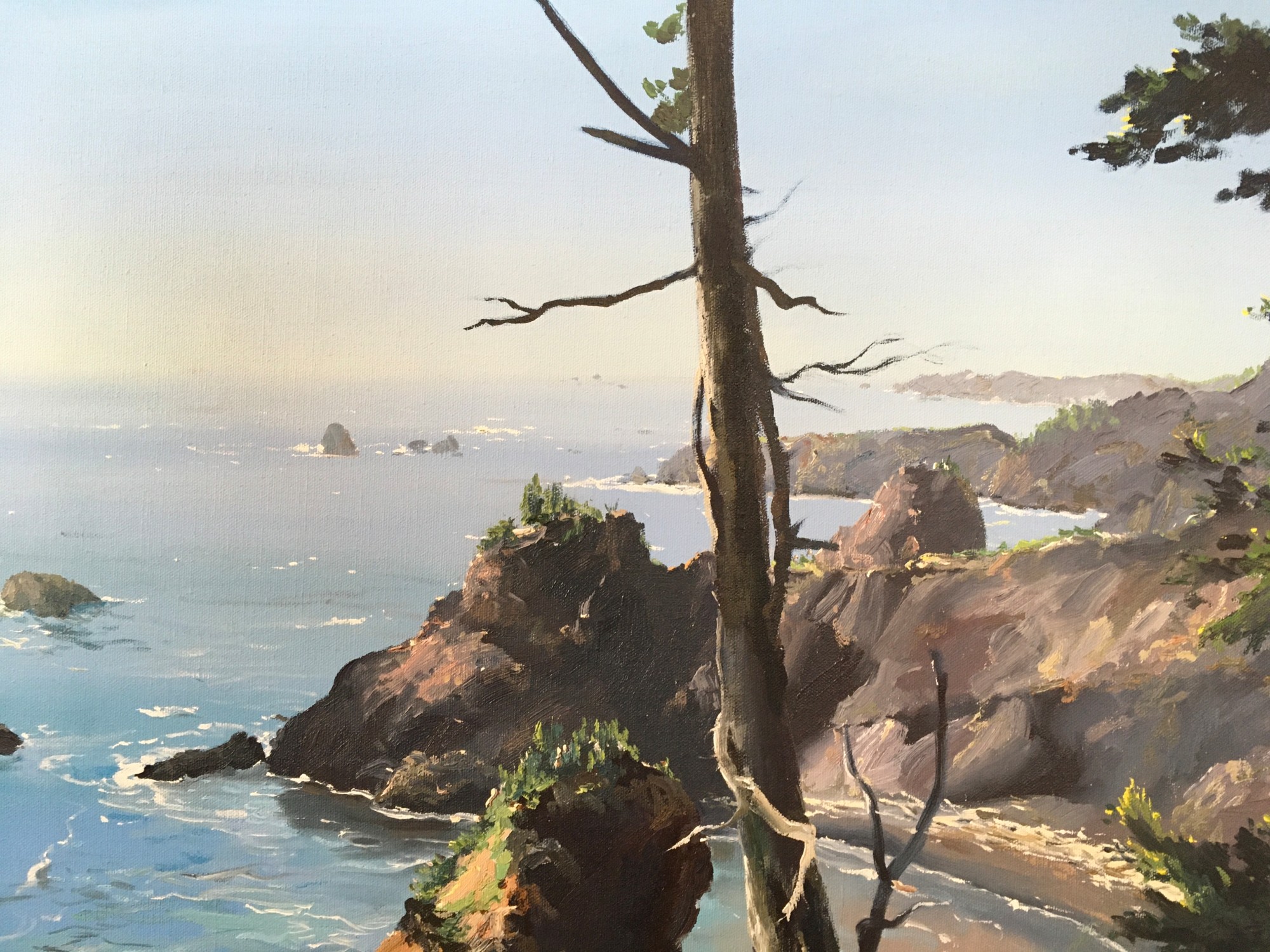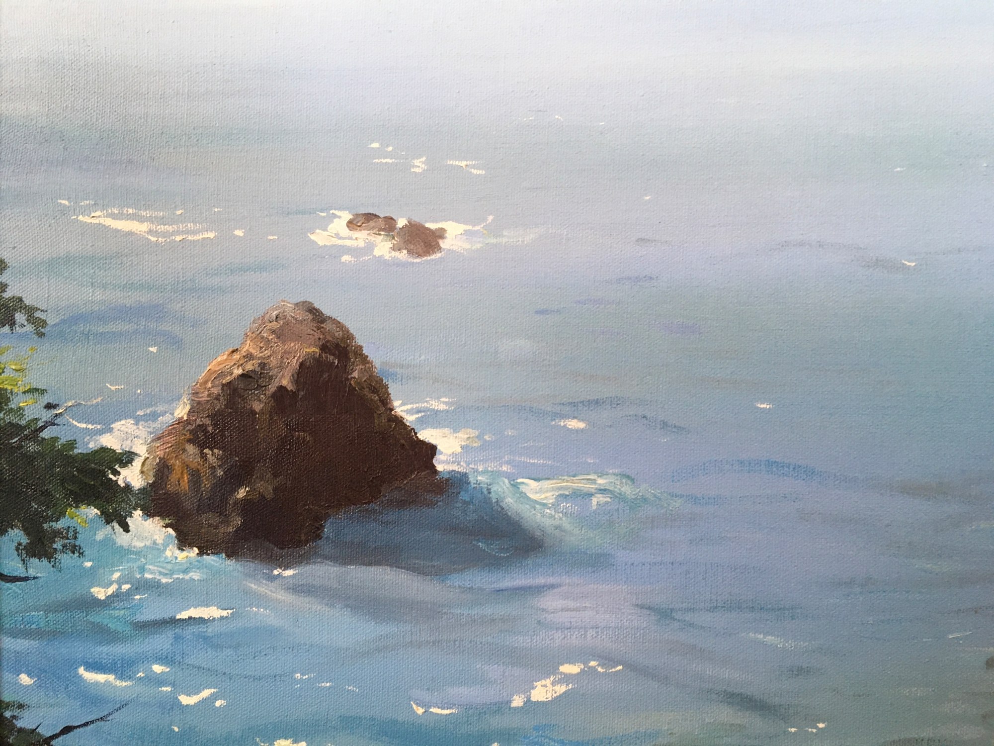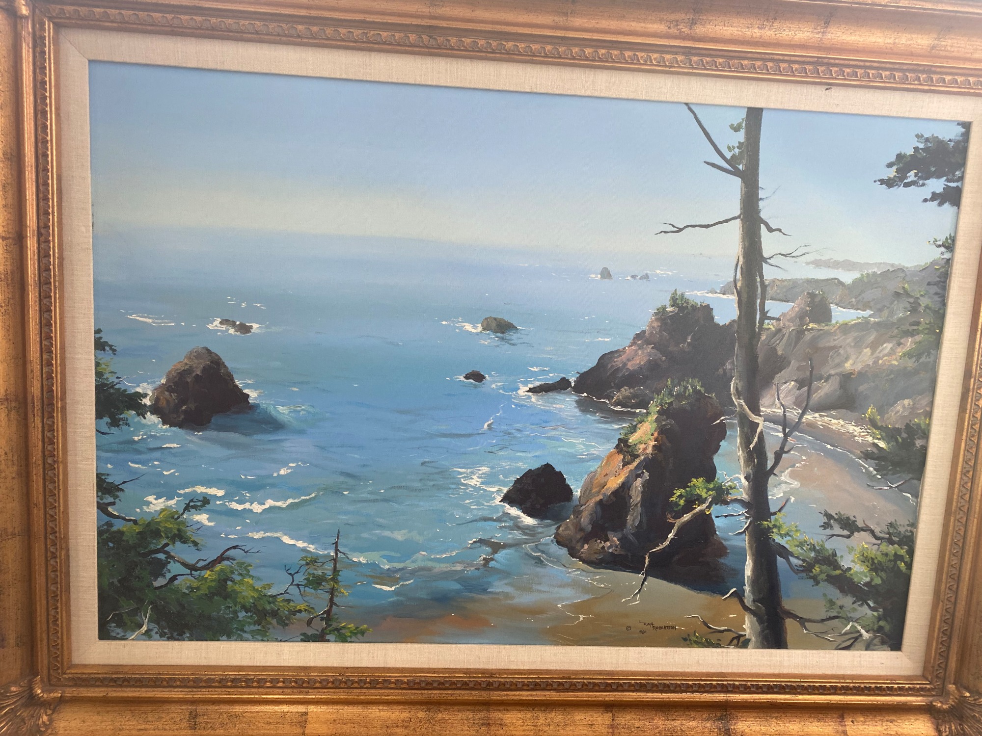 Linda Tuma Robertson’s ‘Southern Oregon Coast’ is an oil on canvas painting depicting a coastline and a vast blue ocean. The coastline is made up of large rock formations that emerge throughout the blue water, outlined by the white foam of ocean waves. The composition is framed in the foreground by green leaves and tree branches, one larger tree trunk emerging from the bottom right and ending at the top right of the picture plane. Robertson uses vivid blues for the ocean, and a palette of browns and greens for the coastline. The serenity and calmness of the water is juxtaposed by the roughness of the surrounding rocks and trees, creating a balanced composition. The absence of any figure disconnects us from humanity and allows for the sole appreciation of nature’s beauty.