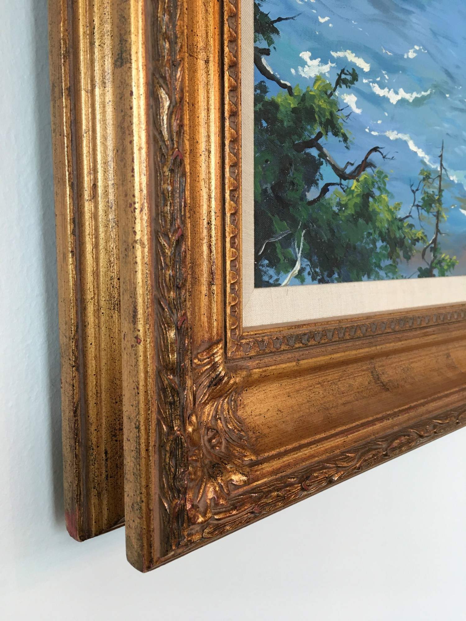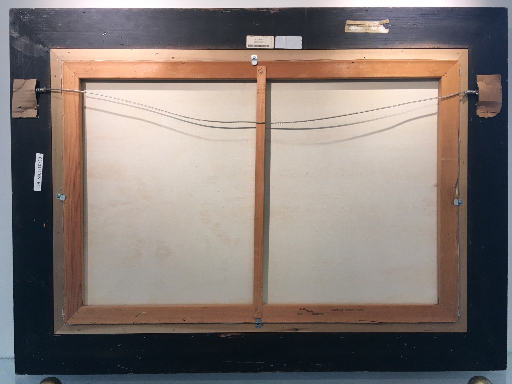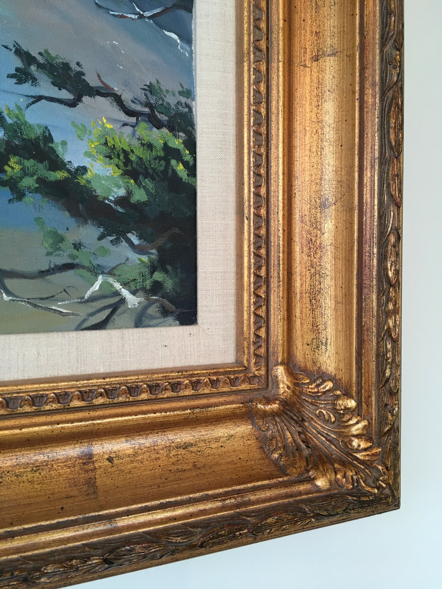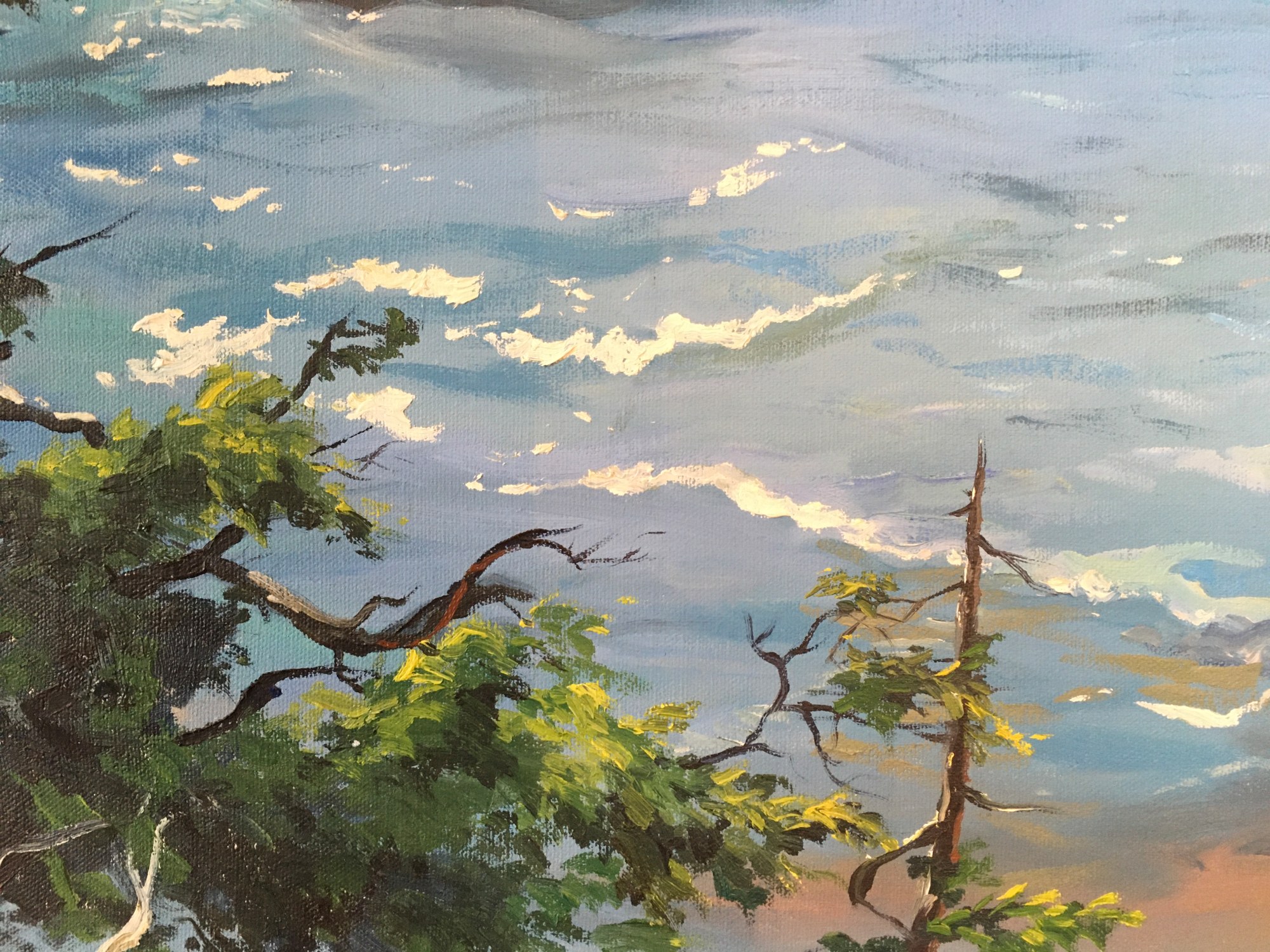 Linda Tuma Robertson’s ‘Southern Oregon Coast’ is an oil on canvas painting depicting a coastline and a vast blue ocean. The coastline is made up of large rock formations that emerge throughout the blue water, outlined by the white foam of ocean waves. The composition is framed in the foreground by green leaves and tree branches, one larger tree trunk emerging from the bottom right and ending at the top right of the picture plane. Robertson uses vivid blues for the ocean, and a palette of browns and greens for the coastline. The serenity and calmness of the water is juxtaposed by the roughness of the surrounding rocks and trees, creating a balanced composition. The absence of any figure disconnects us from humanity and allows for the sole appreciation of nature’s beauty.
