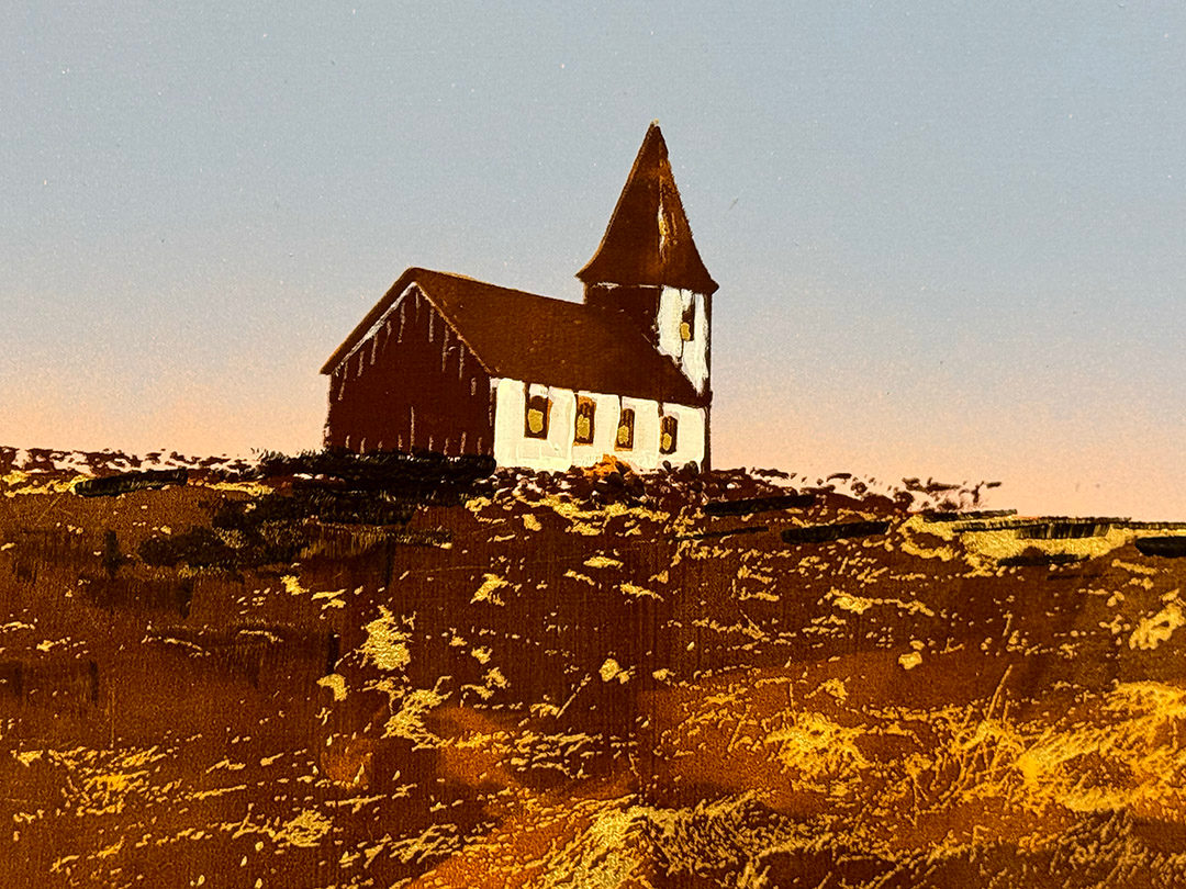 "Sunday Morning Coming Down" is a captivating piece measuring 24"x18", rendered in acrylic and gold leaf. The artwork features a minimalist landscape that draws the eye across a vast, earth-toned terrain. A wooden fence with barbed wire stretches across the foreground, introducing texture and depth to the composition. Beyond the fence, a distant church with a tall steeple stands against a clear blue sky, the simplicity of the scene evoking a profound sense of solitude and expansiveness.