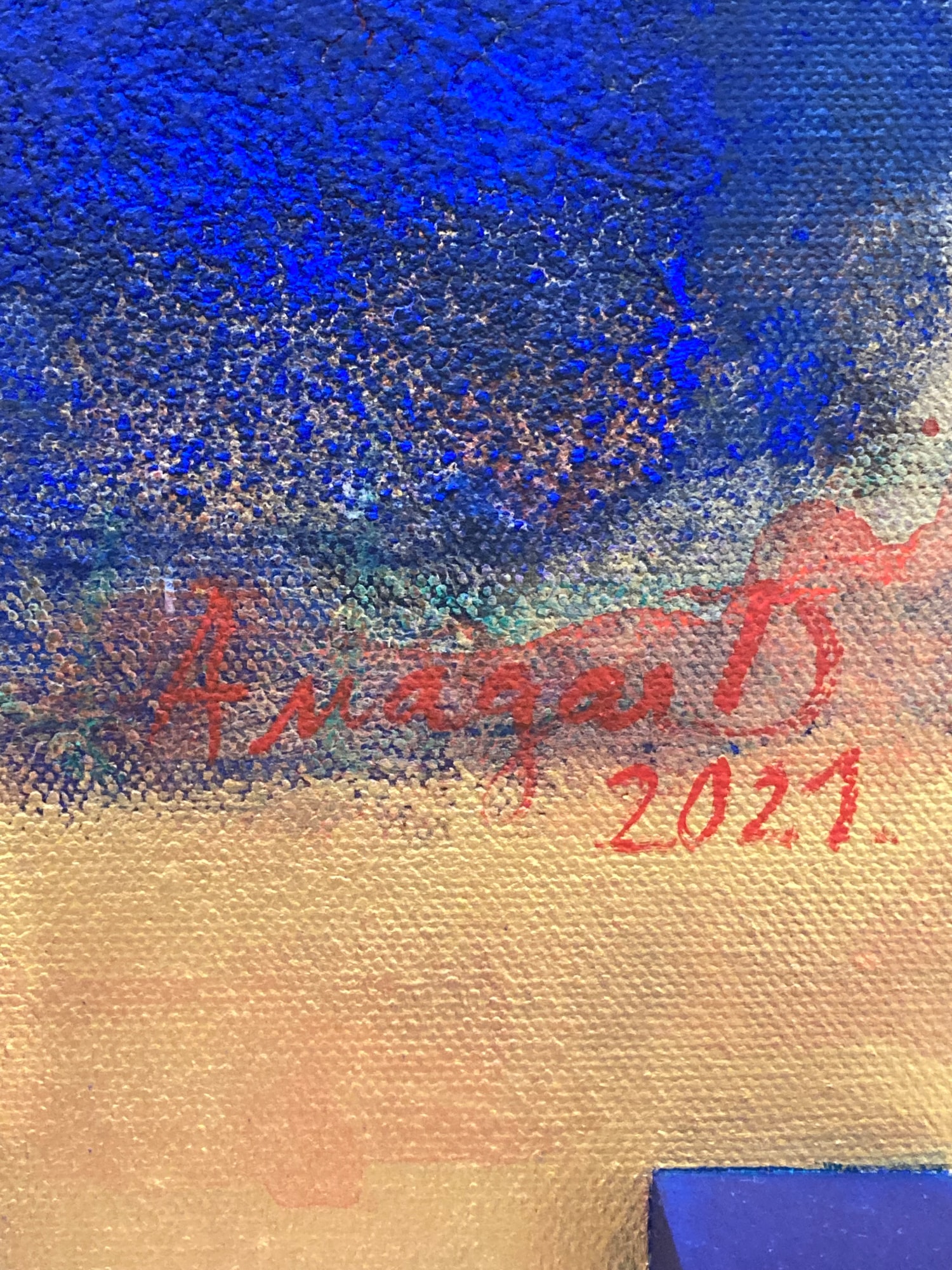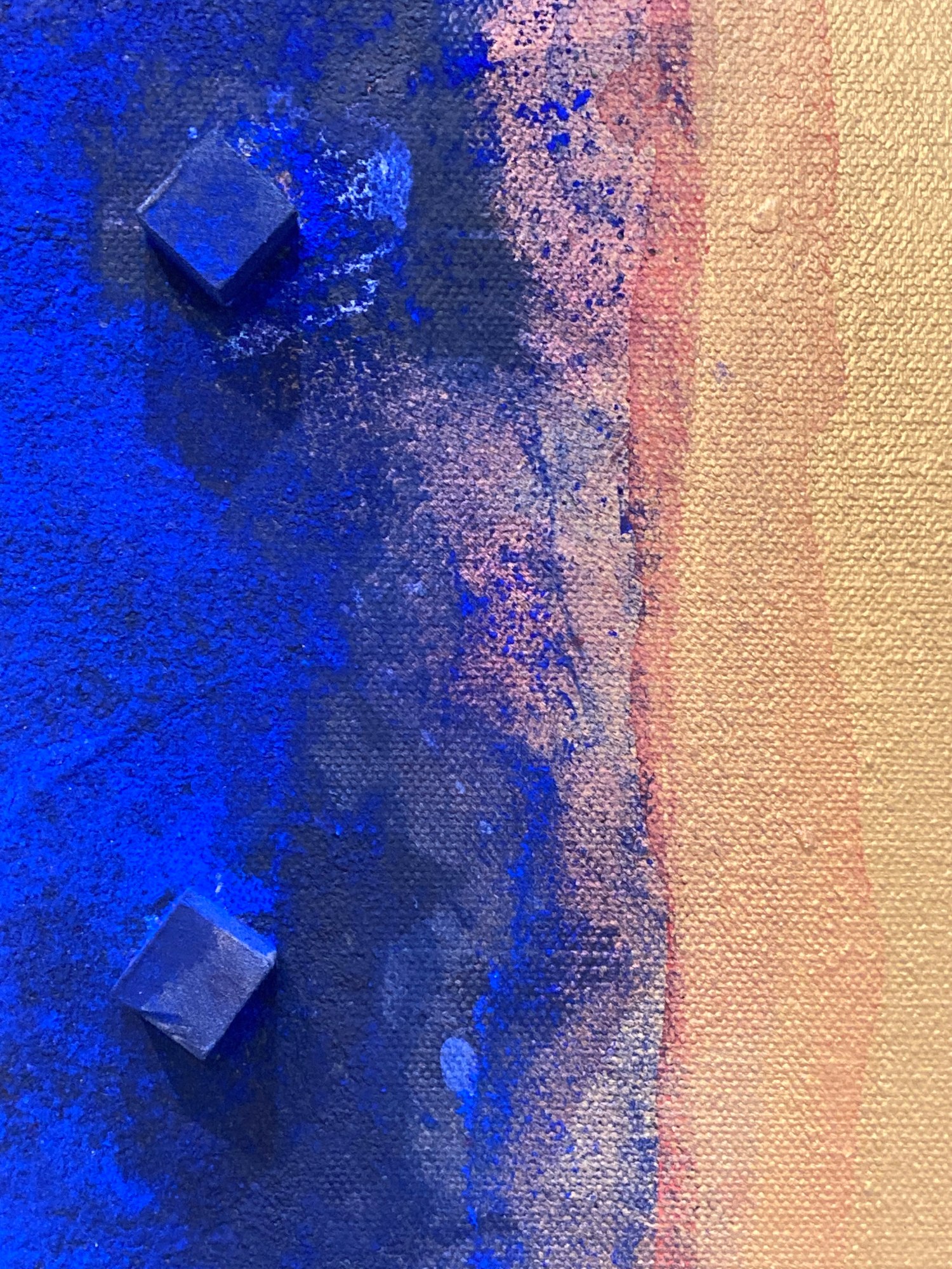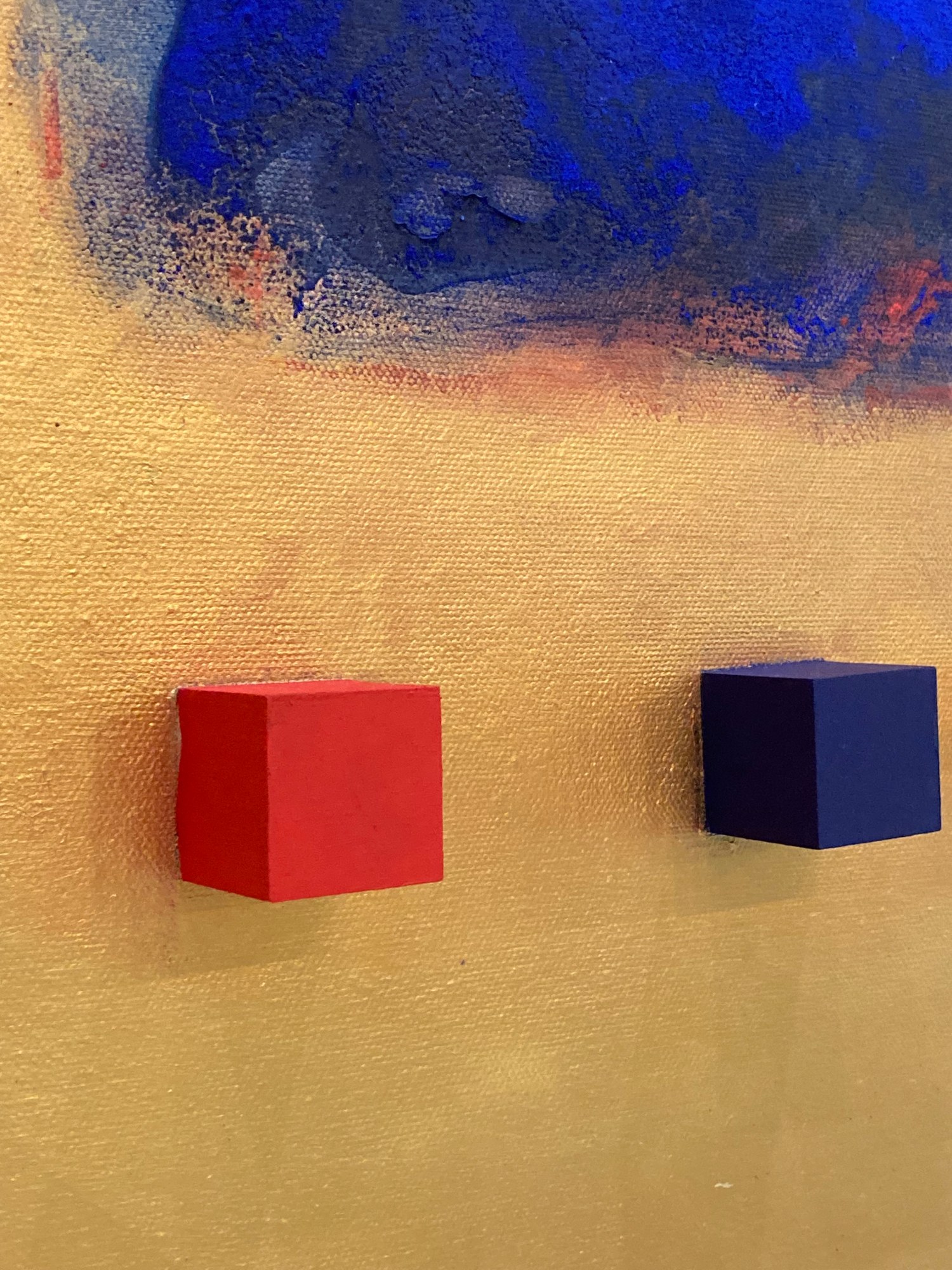 This 48" x 34" mixed media painting, 'Surfacing II,' by Dragana Milovic features an abstracted geometric composition featuring 3d objects adhered to the surface in a palette of gold, blue, and red. "In creating this painting, I used blue pigment and various geometric shapes that emerge from the painting as a consequence of living in a gray town surrounded by various architectural forms that are an integral part of everyday life. A red ball stuck between 2 cubes is an association of a human being stuck in a city crowd."