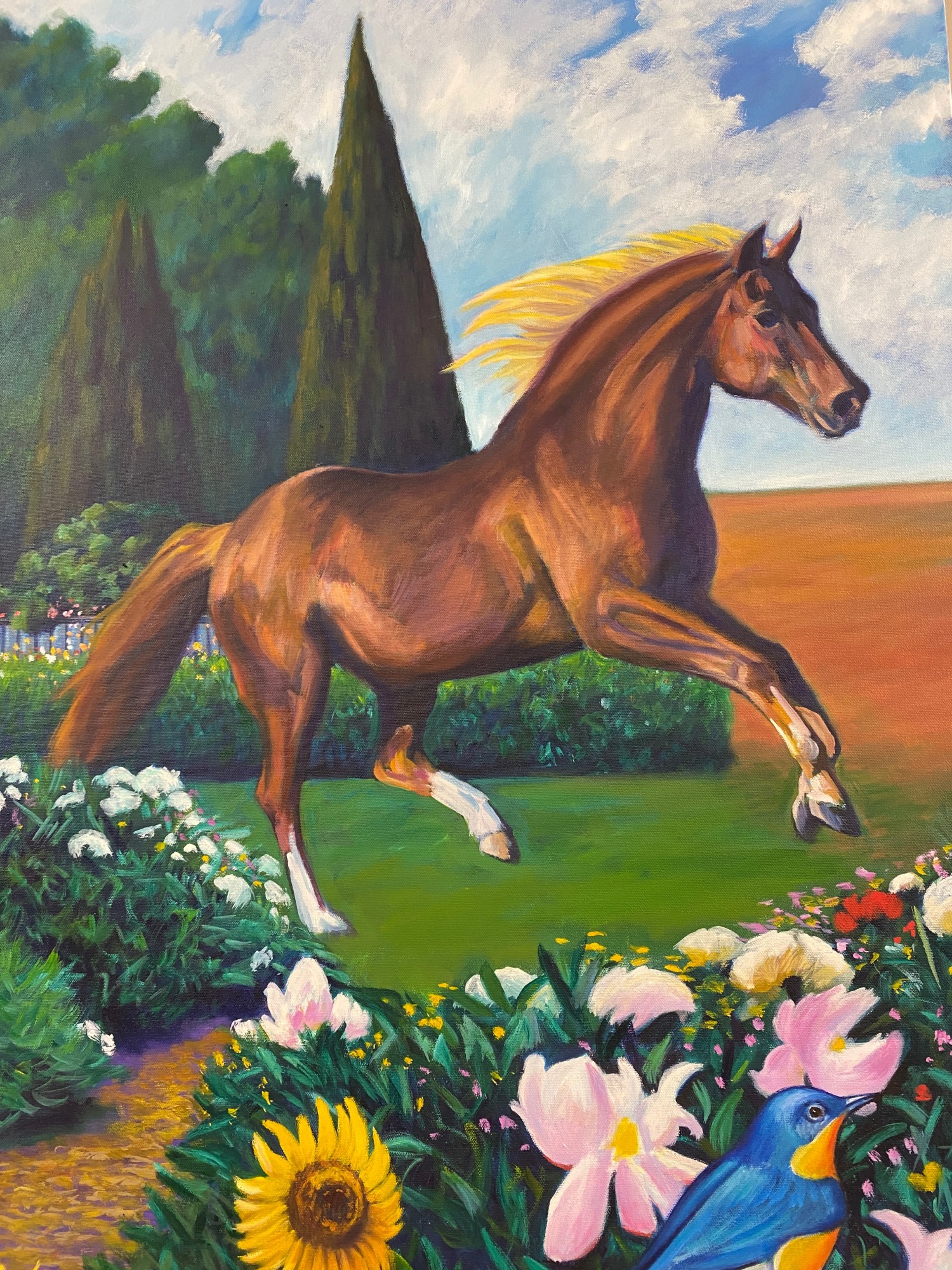 Standing nude woman in a garden with flowers, birds, toys and a running horse.