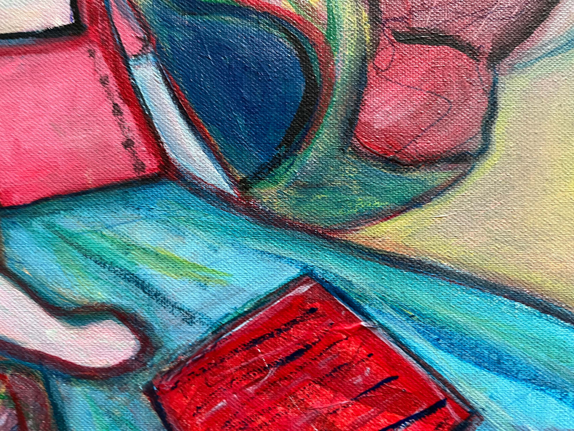 On the left, a woman with a red blouse and a blue skirt is sitting with a red book in her hands. Behind her, on the right, we see from the back a woman's head with brown hair and a pink corsage. Stylized vegetation surround them.