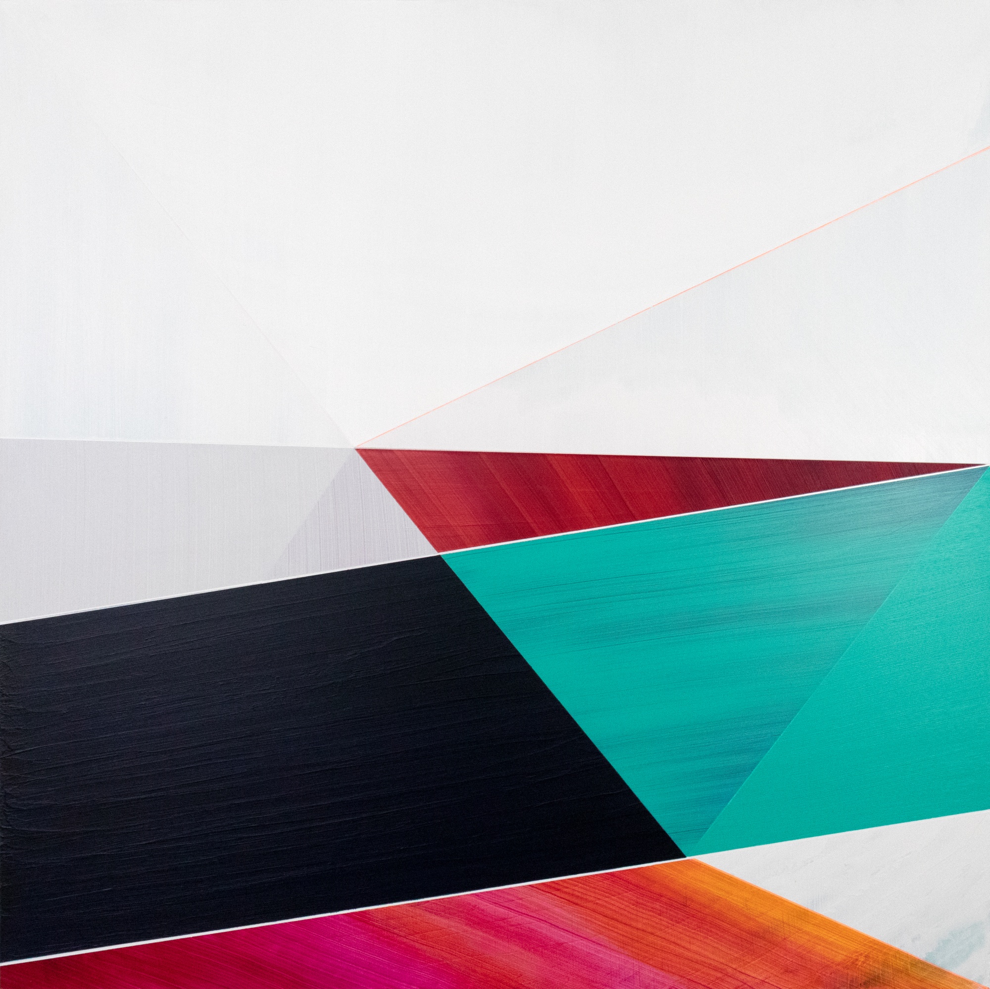 "This is the ninth piece in the Unknown Steps series where I concentrated on creating compositions constructed off of an obtuse angle. In this piece, that focus is the line starting in the lower right corner that reaches up and left before intersecting the blue and aqua fields and continuing to the upper left corner. The other lines were then arranged as an extension of that core structure. Every field was composed of multiple translucent layers resulting in complex depth and visual texture. In the lower sixth of the painting, you can see an aqua underpainting washed over with white impasto fills. Part is left exposed, while the majority of the field was covered first in a thin translucent orange wash before subsequent fluid applications of magenta created striations of brushstrokes and hue interactions." -- Bryan Boone