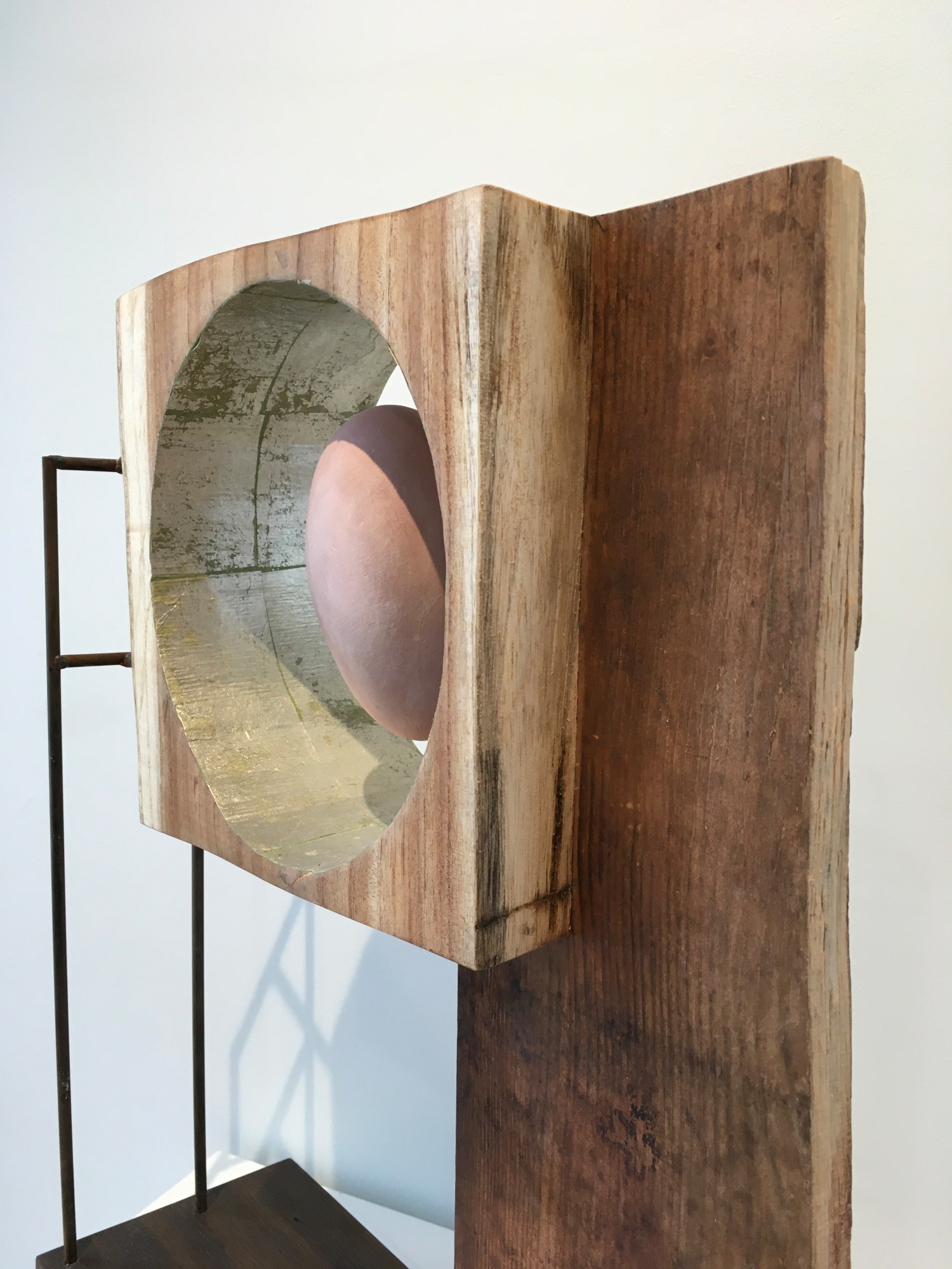 This is a part of the second series of works by John Wolfe entitled, "A Place Behind the Sun", constructed of steel, wood and ceramic. These pieces are all vertical and color has been introduced. The common link between the pieces is the wooden shapes that were throw-aways from a wood turner. There was a conscious effort to minimize components saying more with less. The reduction of the elements will hopefully reveal the true essence of the form.