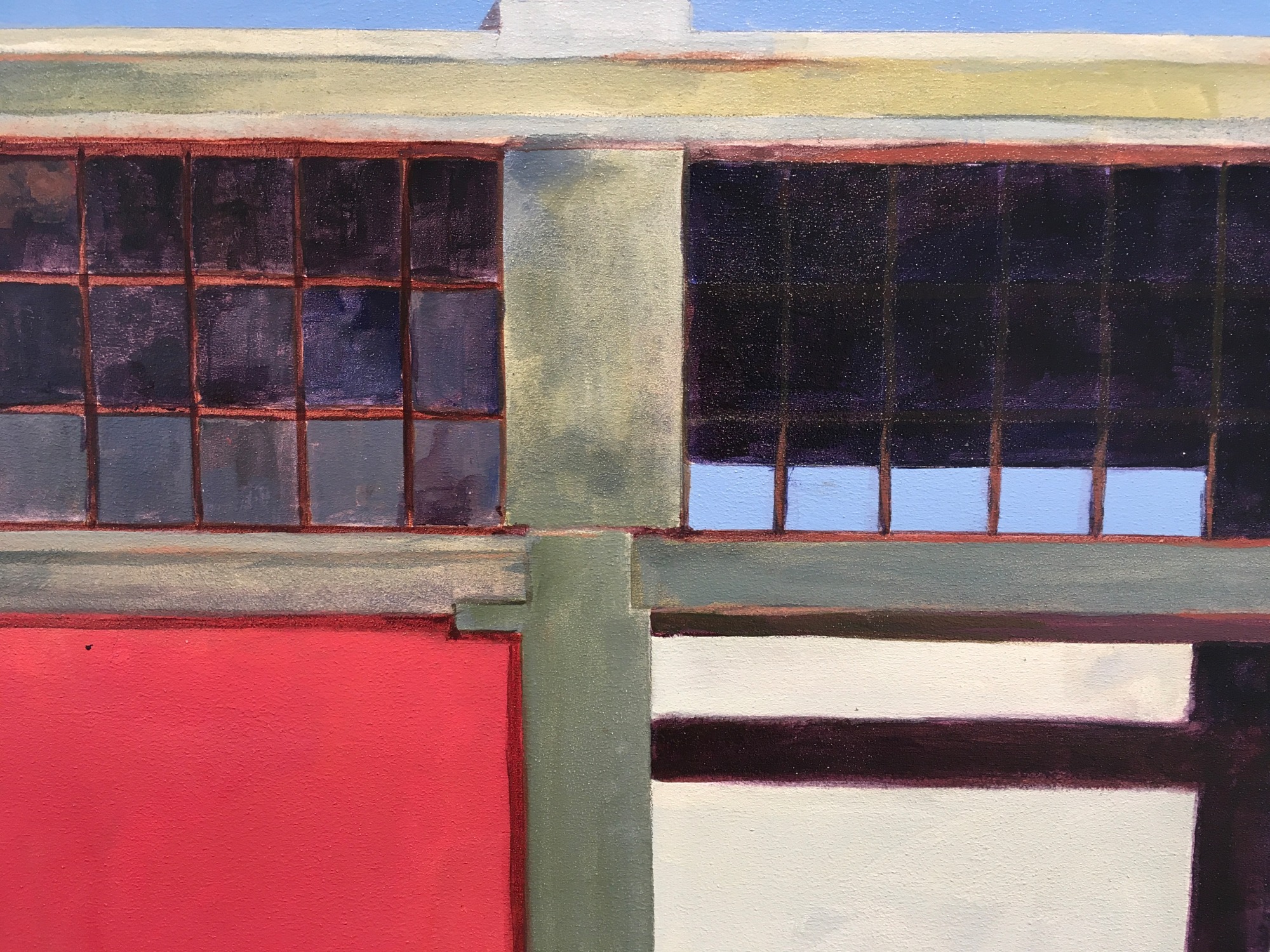 Urban streetscape of an industrial cement building with a vehicle parked within.