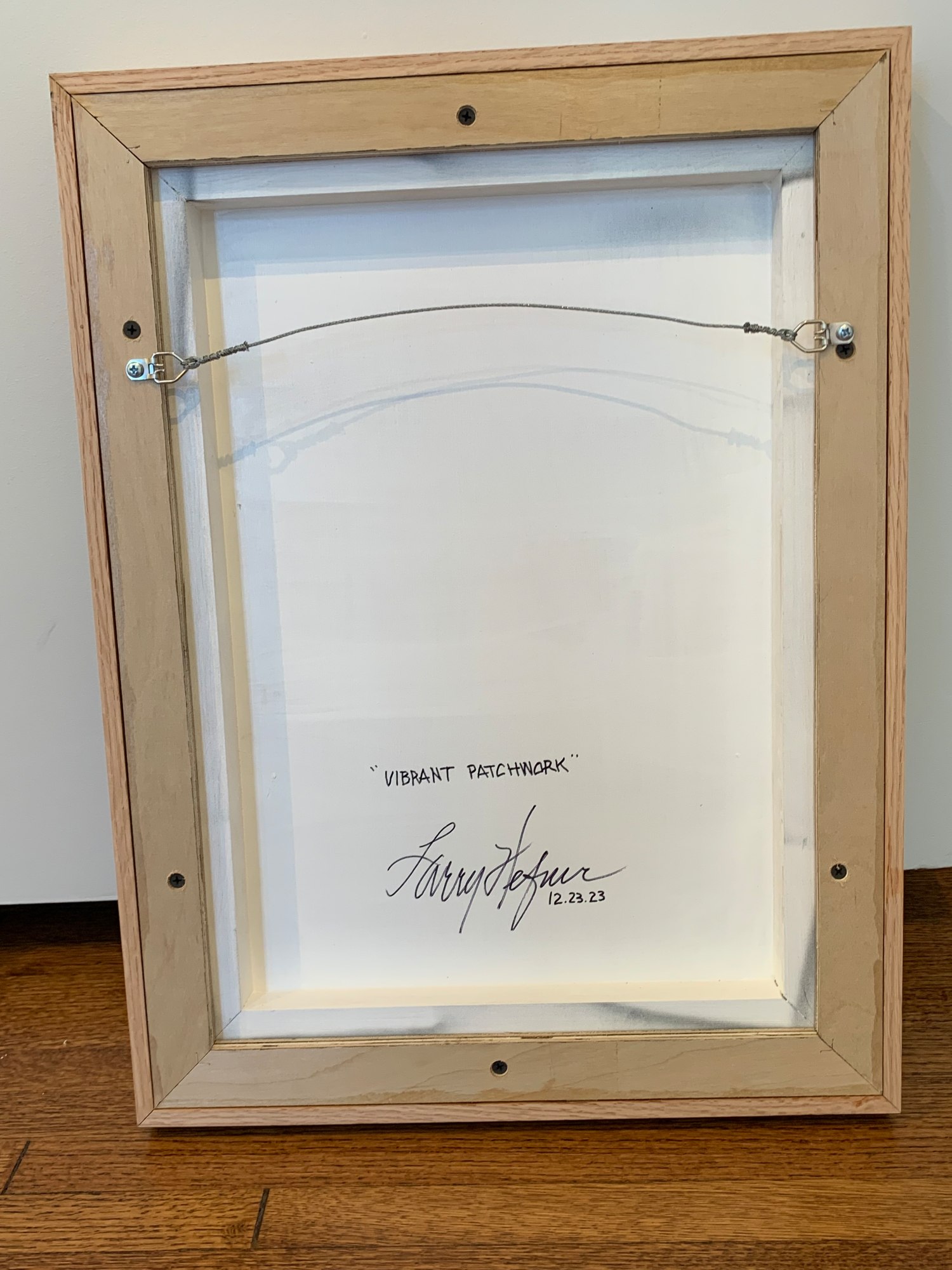 "Vibrant Patchwork" is an abstract painting that bursts with energy and color. The artwork features a dynamic mix of shapes, patterns, and textures, creating a rich and layered composition. Splattered and smeared colors in yellows, pinks, blues, and hints of green create a lively background, while a variety of shapes, including circles, ovals, and rectangles, add depth and complexity to the piece. The use of both straight and curved lines, as well as visible brushstrokes, adds to the artwork's sense of movement and spontaneity. Overall, "Vibrant Patchwork" is a stimulating visual mix that evokes the dynamic and expressive nature of contemporary mixed media art.