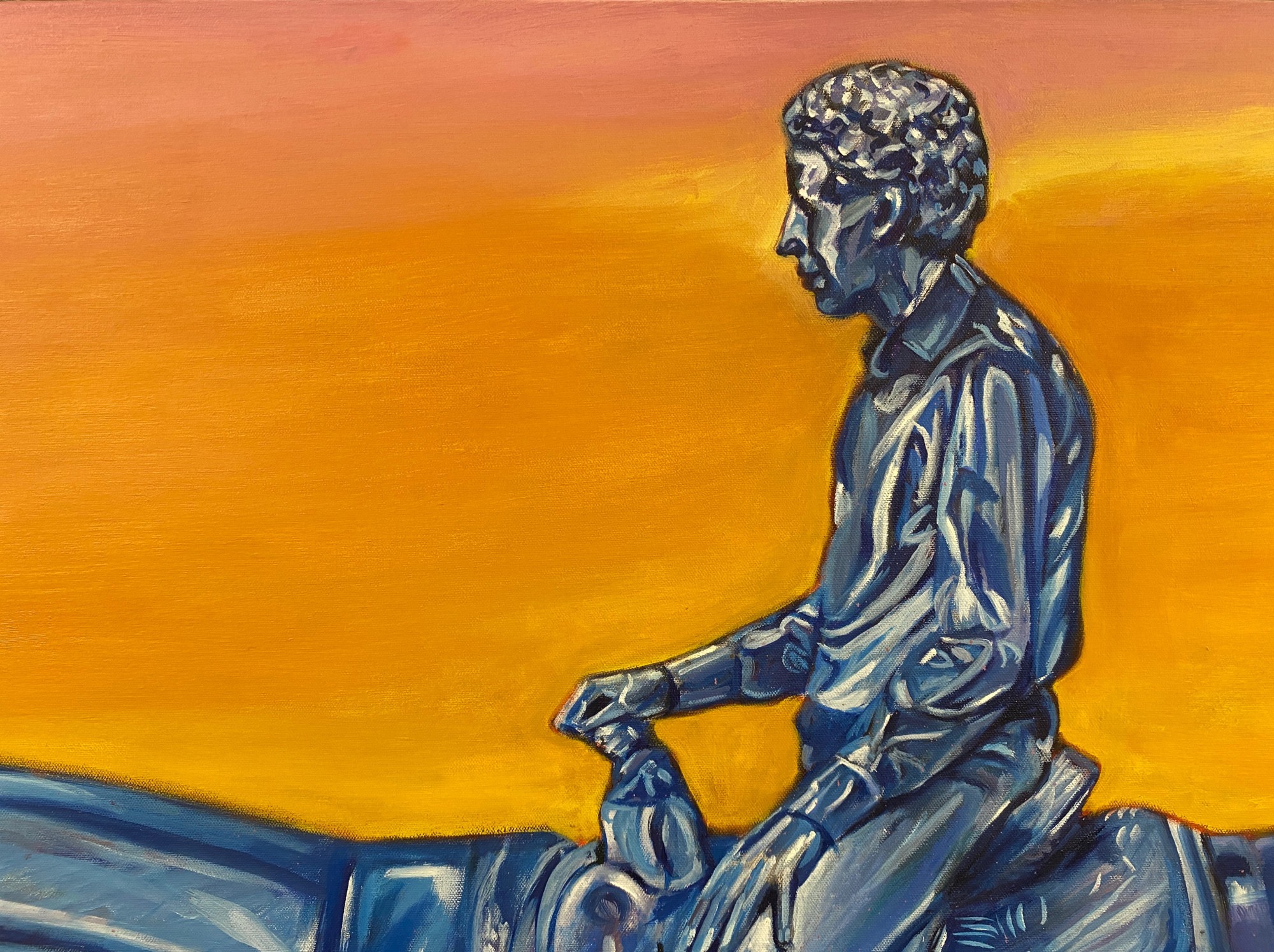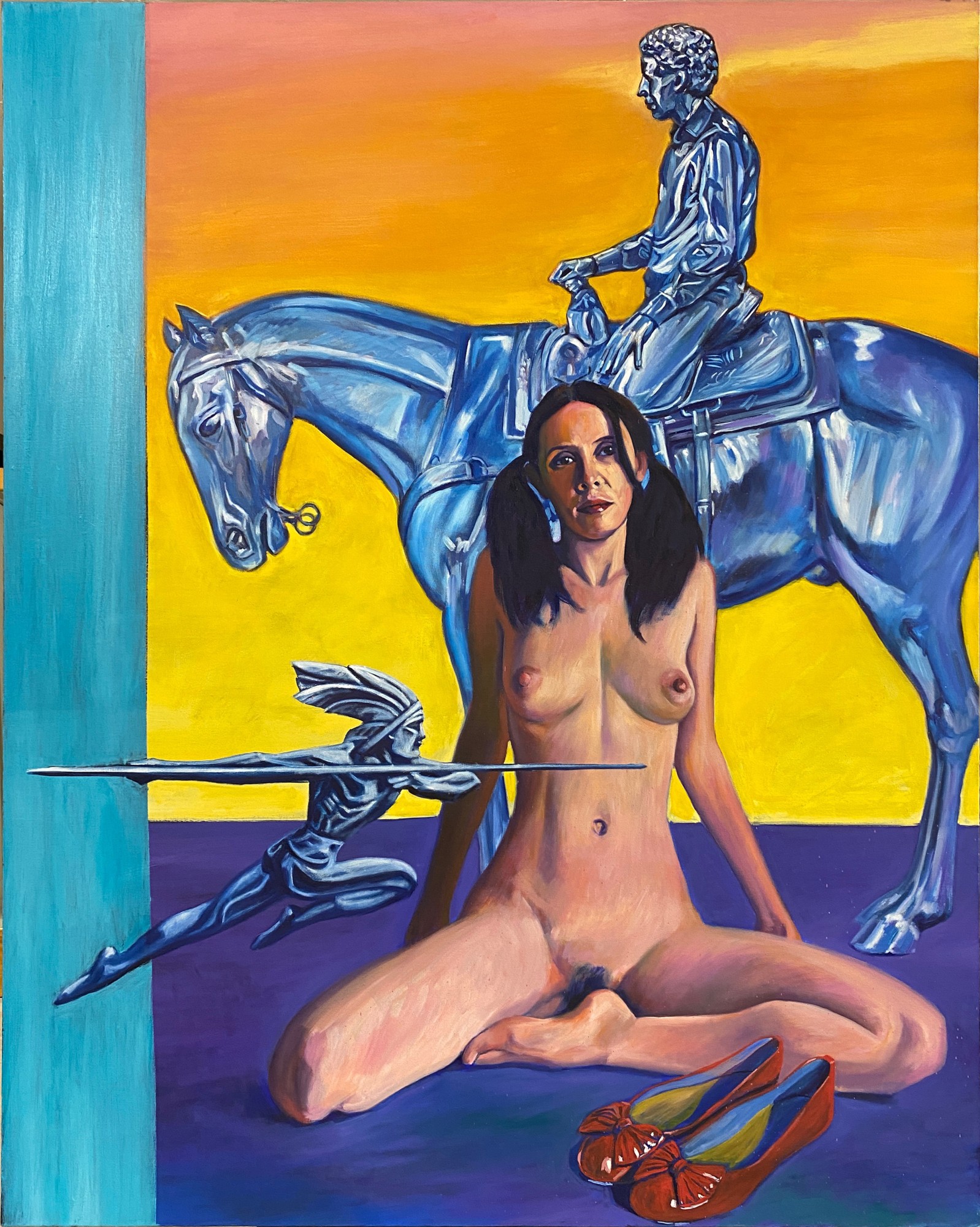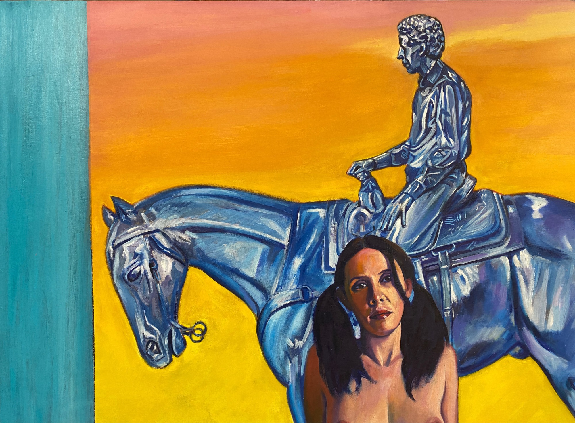 Sculpture of a rider on a horse with a nude woman in foreground and Indian ornament.
