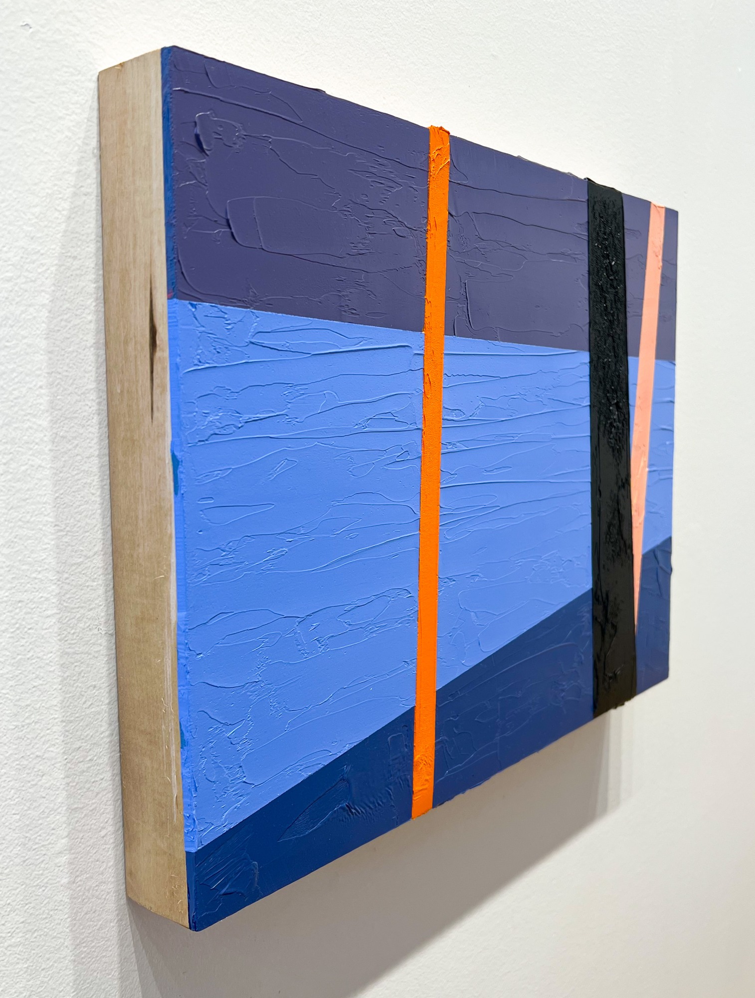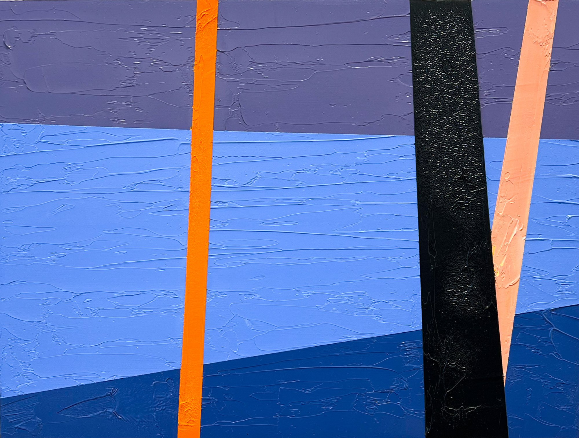 This painting plays with the cool winter blues and sunset hues in vivid textures and juxtaposing angles.