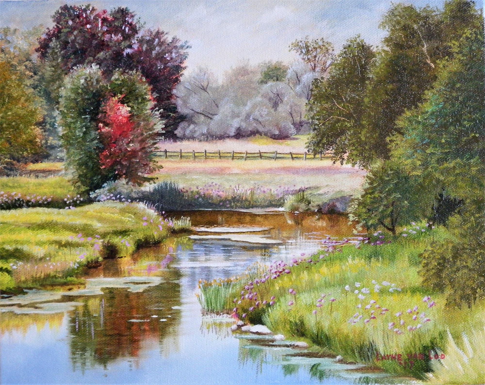 Painted in the studio, this scene is of Medway Creek directly across the road from the Arva Mill, Arva Ontario.