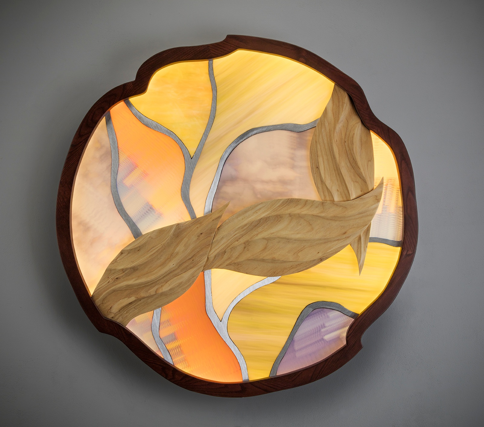This artwork features back light photographic images from artist Mark Weller. The sculptural elements and design by Aaron Laux.