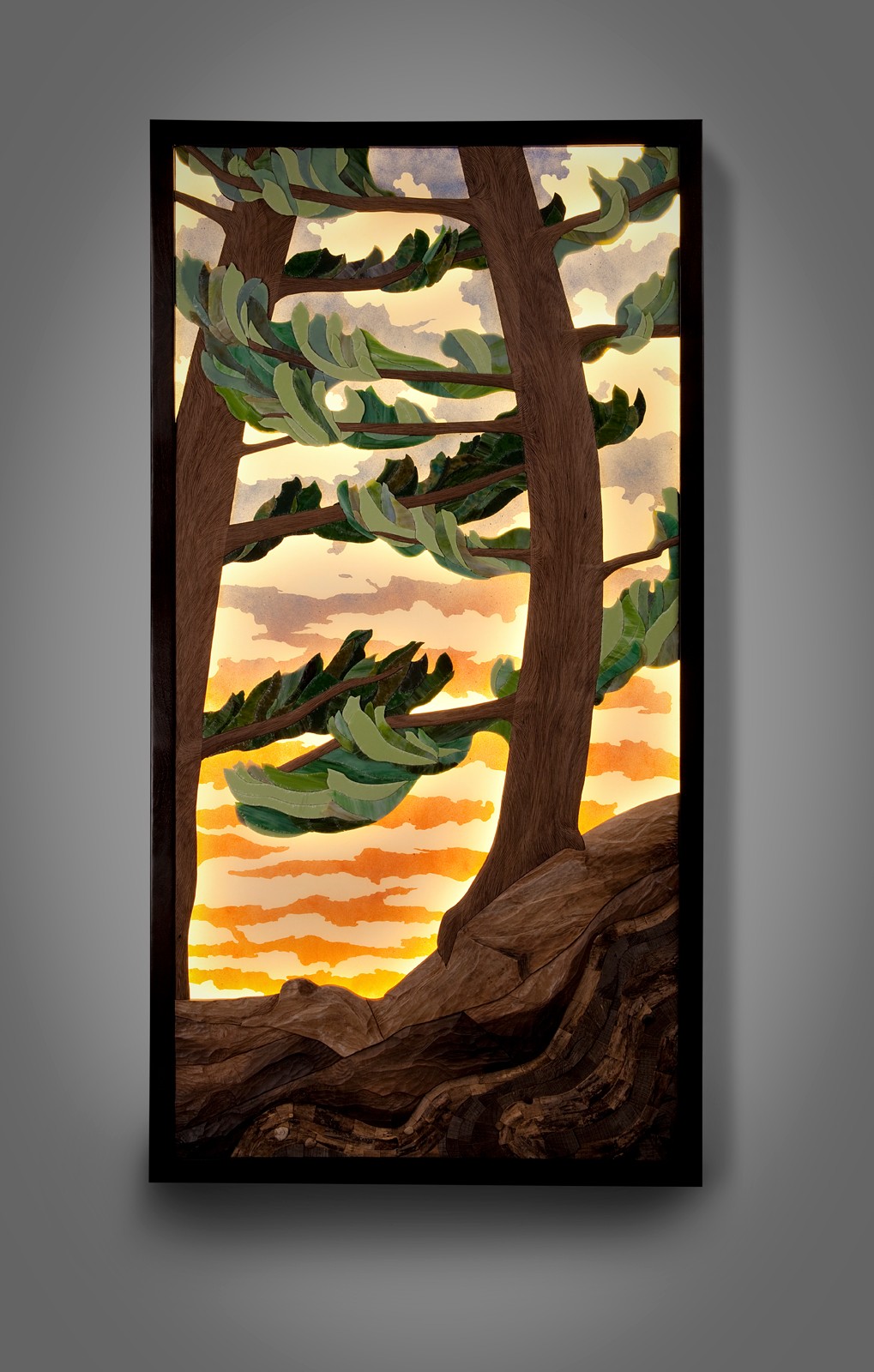 This artwork is a sculptural relief that features walnut wood, contemporary glass mosaic, architectural rice paper and LED back lighting. An adaption of a "flint knapping" technique was used on the glass to give depth and texture to the surface. Naturally weathered wood and bark were also used as mosaic elements along with carving. Specialty LED components were used to illuminate the acrylic backed rice paper. The site for this artwork was established during the design phase. There are strong Biophilic design elements through out this building including a stone wall, numerous windows providing natural lighting and the artwork which features organic textures and colors. The site for the artwork was intended as a focal point and to counter balance the dominate stone wall. There is a general feeling of fluidity between the out doors space and the indoors space. I worked directly with the project manager of this job who delivered the artwork concepts to the committee who then shared their ideas with me. There was an interest by the committee to pay homage to the local natural ecosystem and the white pine was chosen as the emblem and representative of this landscape. The final accepted concept was an abstract rendition of twin white pines growing from a rocky craig with a sky background. The committee also asked that the artwork have a dramatic effect and be a focal point for the atrium. This was achieved through the dynamic composition and lighting effect which gives the sensation of looking through a window into a wholly different landscape. It was truly a pleasure working together with the project management team as well as the staff of Essentia Health, this is an impressive building featuring Biophilic design throughout. The initial response to the artwork has been overwhelmingly positive, as Laura Pfenninger the Essentia Health project coordinator stated “Aaron Laux’s piece, DEFINITELY created the WOW factor we were looking for in the new Essentia Health Sandstone hospital. He was great to work with and was able to meet our fast turnaround time and budget.”