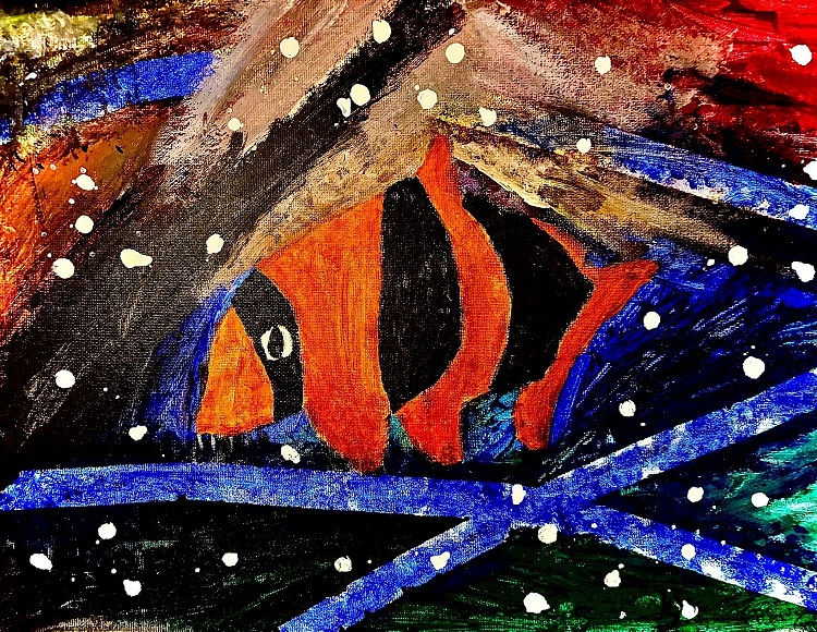 This clown loach swims quietly, surrounded by a gentle underwater world. Its orange and black stripes ripple against the calm blues and greens. I painted it to capture what peace looks like beneath the surface—graceful, unhurried, content. Sometimes, serenity isn’t loud. It just glides by, reminding us to slow down and breathe. Clown loaches are a type of freshwater fish. They have black stripes on their body, just like tigers, Clown Loaches are found mainly in south-east asia but native to indonesia. These awesome creatures are also kept in aquariums.