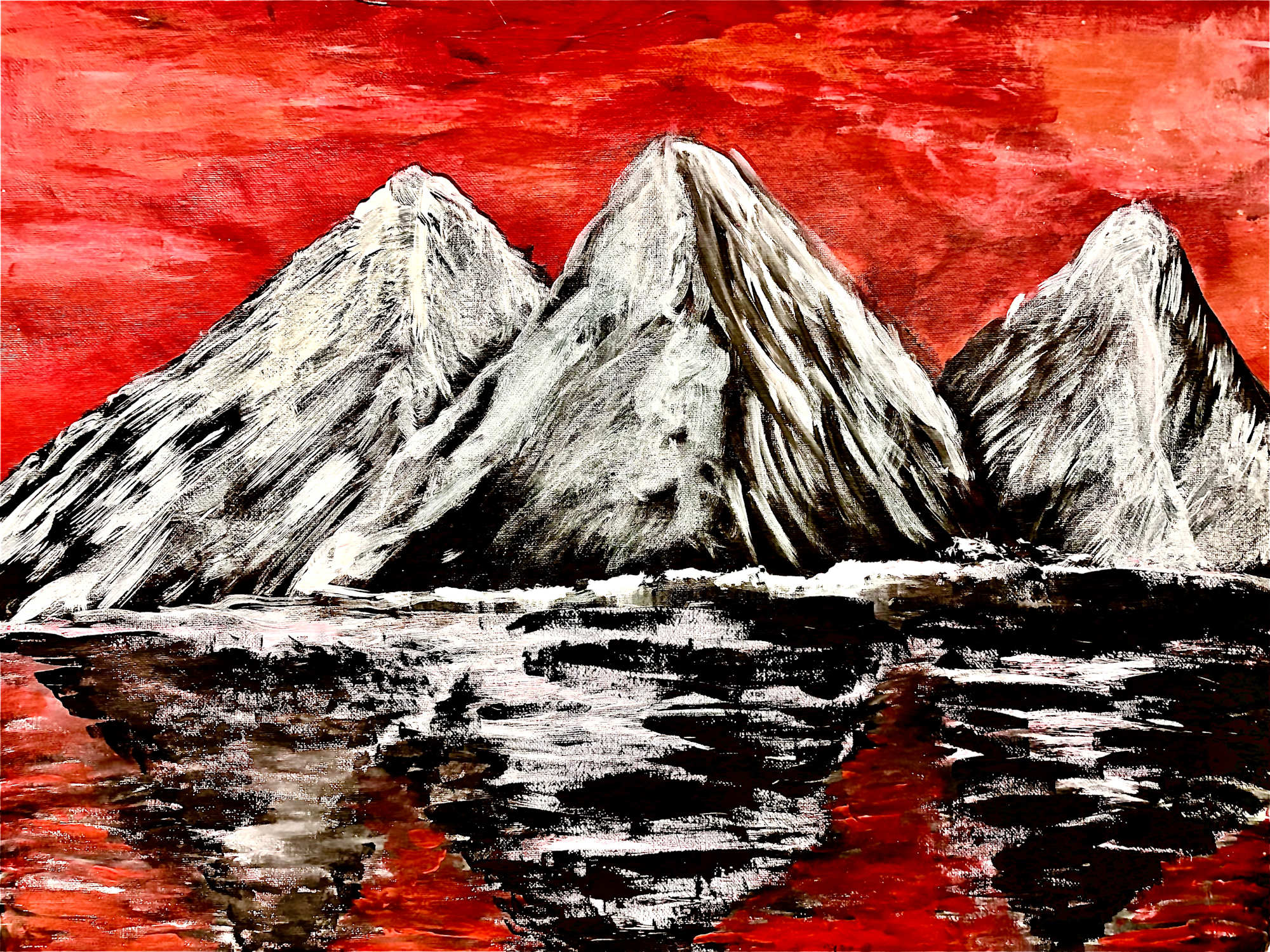These mountains stand boldly beneath a fiery red sky, silent and strong, like shadows of something ancient and powerful. Most people paint mountains under calm blue skies, but I wanted something different. The red background came from my imagination which is a symbol of emotion, intensity, and change. This piece feels like a dream or a memory: vivid, dramatic, and mysterious. It reminds me that sometimes, even stillness can burn bright.