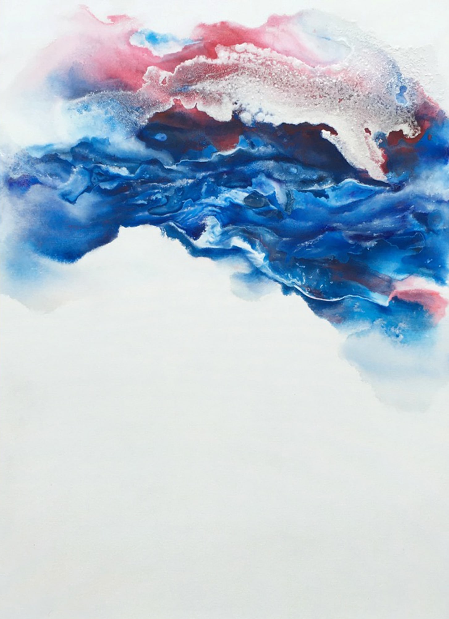 “Red Sun" is part of Indigo Dreaming series. This series is an attempt to forego of the element of control and allow colors to interact freely with each other. The main hue in this series is the various shades and intensity of blues. For each painting, a secondary hue is also selected randomly—with an understanding that there is variety in any given hue.
