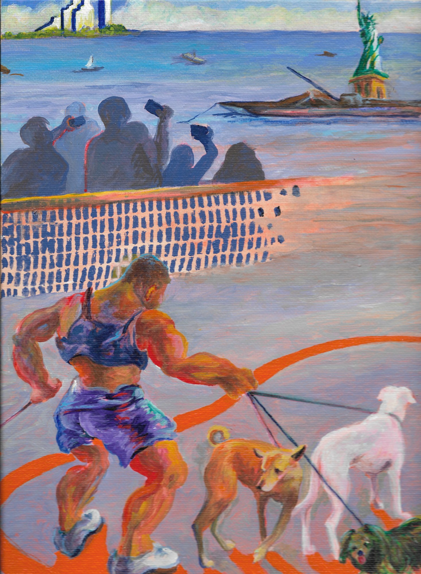 - Subject Matter: Person walking their dogs with a boat and statue of liberty in the back