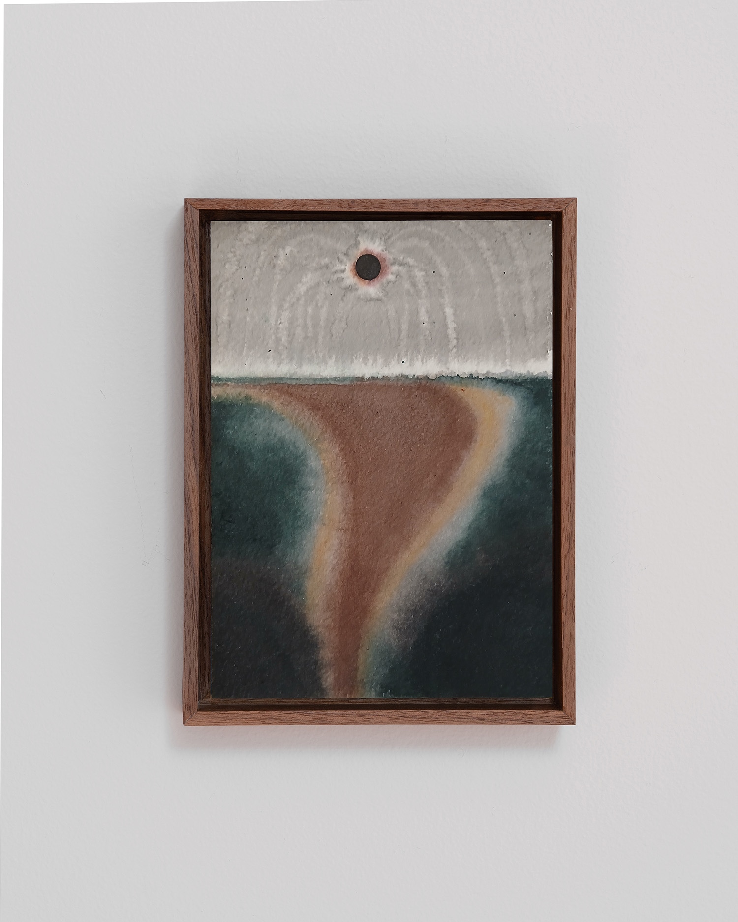 - Ink on archival watercolor paper mounted to panel in walnut frame