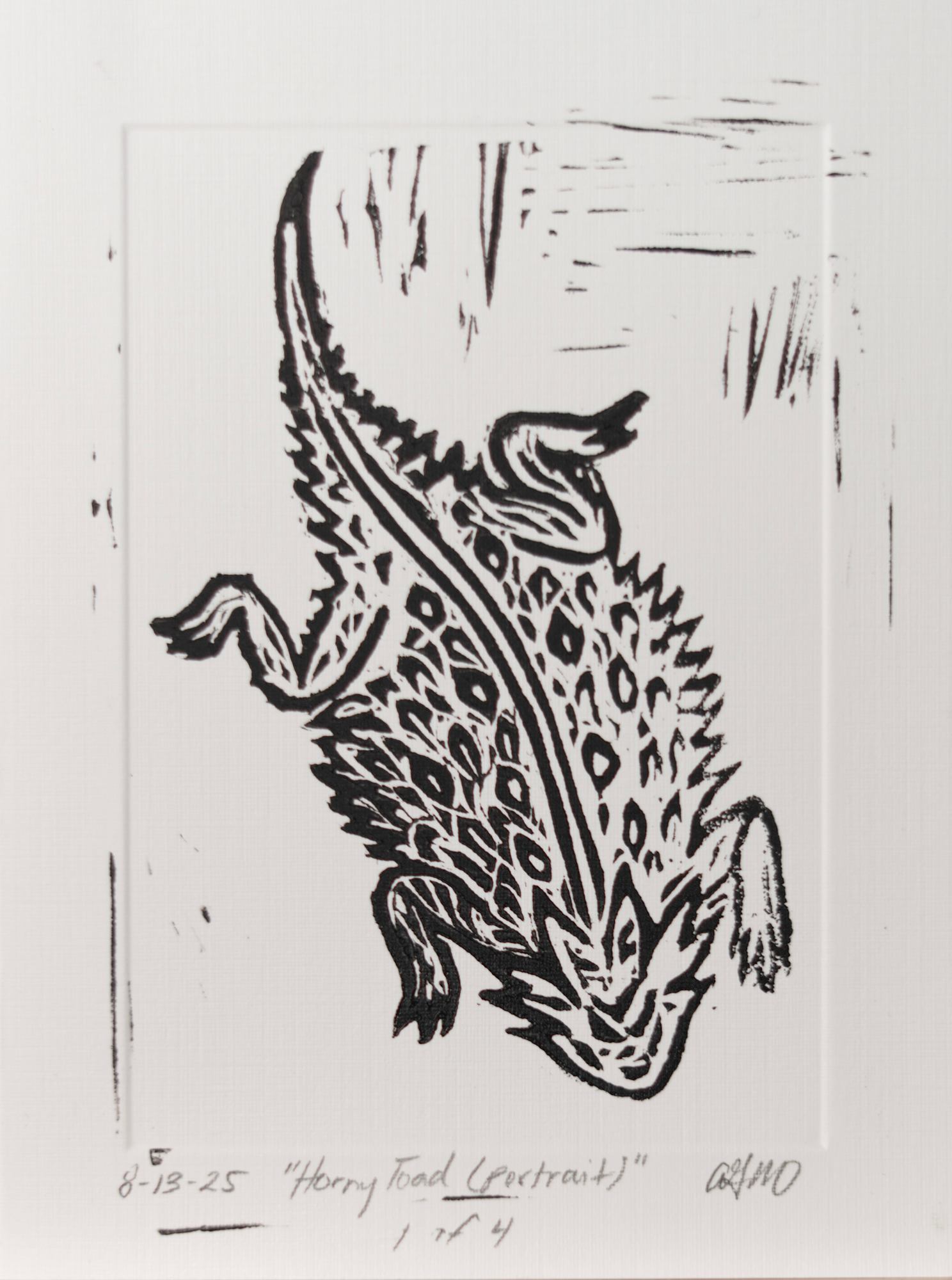 This limited-edition linocut celebrates the Texas Horned Lizard or "Horny Toad", a small round and spiked reptile native to South Texas. It's said if you catch one and hang it from its tail on a fence, you can summon rain. The image was produced in two orientations—four in landscape format and four in portrait—each numbered separately to preserve the rarity of the edition.