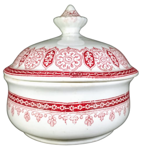 Soap Dish, 5.125 x 4 x 3.5 inches. Red transfer. The printed garter mark has the name of the pattern, "Florida" and the initials "T. F. & S." of Thomas Furnival & Sons the maker. According to the diamond registry mark, the pattern was registered 29 March 1871. This geometric pattern consists almost entirely of a variety of stylized flowers. The narrow horizontal band on the body of the soap dish is comprised of stylized flowers, below which are alternating stylized flowers and leaves. The same narrow horizontal band appears around the lid base and above are alternating lozenges in-filled with a stylized flower and leaves and large eight-petalled stylized flowers. The knob on the lid features interlocking rings.