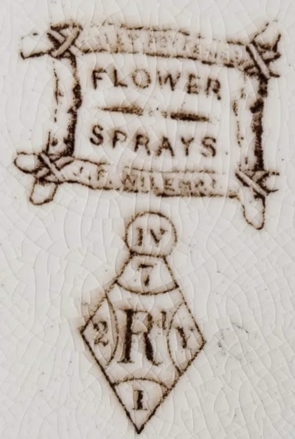 Serving plate, 10.5 x 9.625 inches. Brown transfer. Printed maker's mark for J. F. Wileman. The registry diamond dates the pattern registration to 7 July 1879. This simple pattern features a bouquet of different flowers and leaves clustered at the bottom of the plate. Trailing vines with flowers extend up either side.