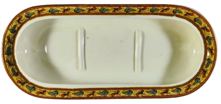 Lidded toiletry dish, 7.5 x 2.75 x 1.25 inches. Printed and impressed maker's marks for Mintons. This dish was originally part of a toilet service, which was a set of objects used at the dressing table. The "Gorse" pattern features sprigs of the eponymous flower placed on every side of the dish. The molded knob handle is printed and painted to resemble a stylized flower. The thin border features two lines sandwiching an undulating vine with highly-stylized foliage set against a solid background.