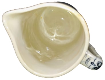Pitcher, 7 inches tall. Black transfer. Printed maker's mark for Burgess & Leigh. The "Ionia" pattern features a collection of cartouches filled with stylized floral and foliage motifs and floral sprays. The large rectangular cartouche on the handle-right side has a keyhole pierced by roses. The border consists of a simple repeated geometric pattern of alternating circles and ovals.
