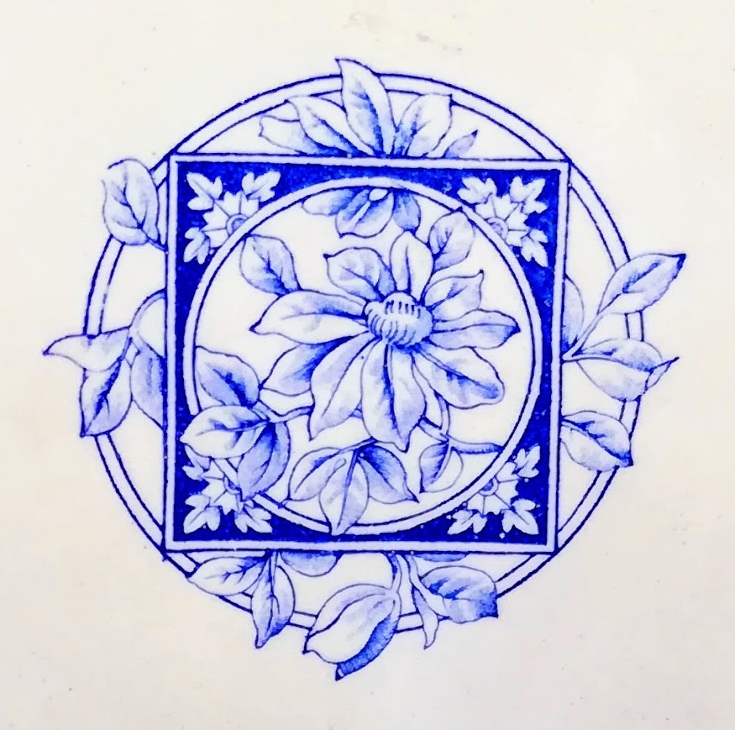 Plate, 9.5 inches diameter. Blue transfer. Printed and impressed maker's marks for Thomas Till & Sons. This lovely Aesthetic floral pattern features a central square medallion with a clematis laid over a circular medallion filled with foliage. The wide border consists of panels with flowers separated by half-diamond cartouches filled with a stylized flower and foliage motif. The flowers resemble clematis, cherry, trumpet vine, and nasturtium.