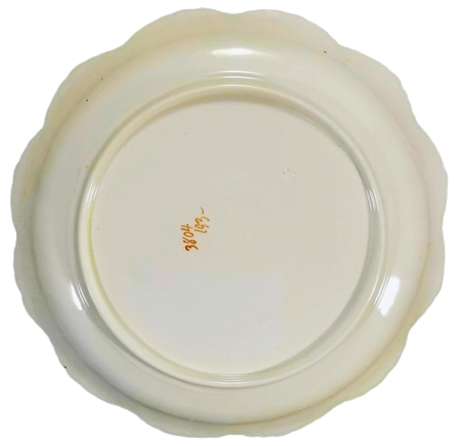 Serving plate, 11.75 inches diameter. Brown transfer with polychrome clobbering. Indecipherable impressed maker's mark. Red painted pattern number, "3804/193." The plate has a scalloped rim with bits of gold here and there, and the raised molded lines, pointing inward have a spattering of gold dust. The leaves are a mixture of blue and gold while the nuts have brown centers and lighter colored outer foliage. There are two horizontal sprays across the middle of the plate and two smaller ones at the top and bottom of the plate.