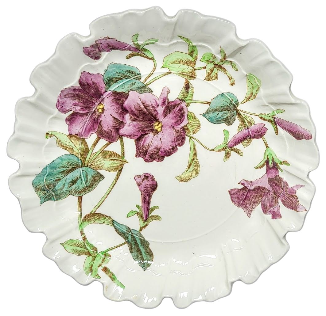 Ruffled plate, 9 inches diameter. Brown transfer with polychrome clobbering. Impressed maker's mark for Brown-Westhead, Moore & Co. Green painted pattern number "B6010." This simple floral pattern features a spray of petunia flowers and buds on a leafy steam arching around the well of the plate.