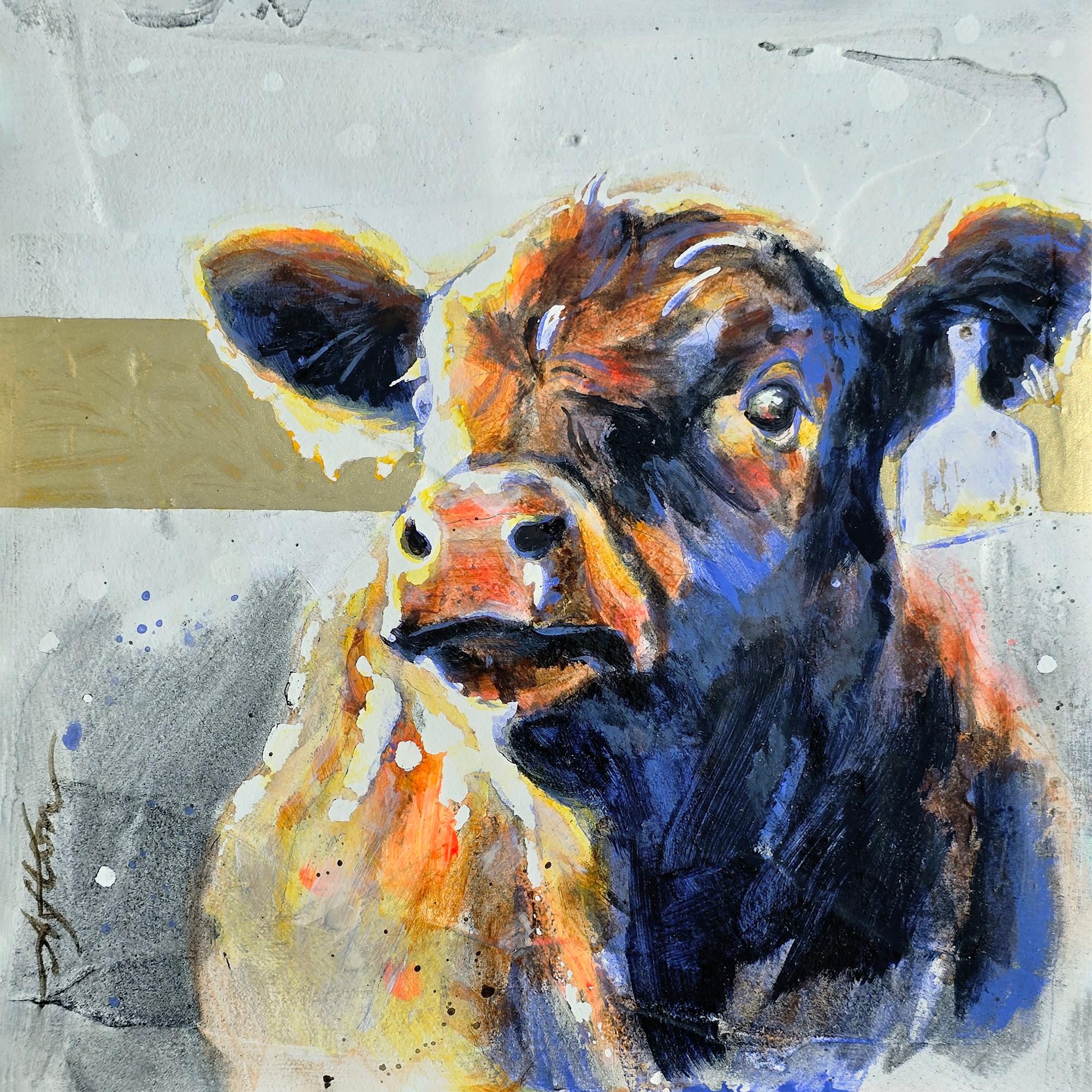 A Black Angus calf against a modern metallic gold stripe. Mixed media includes a stylish mud texture on a wood panel with charcoal, acrylic, and gold oil medium. A wet look varnish elevates the depth and style. Finished edges allow display without the need for a frame.