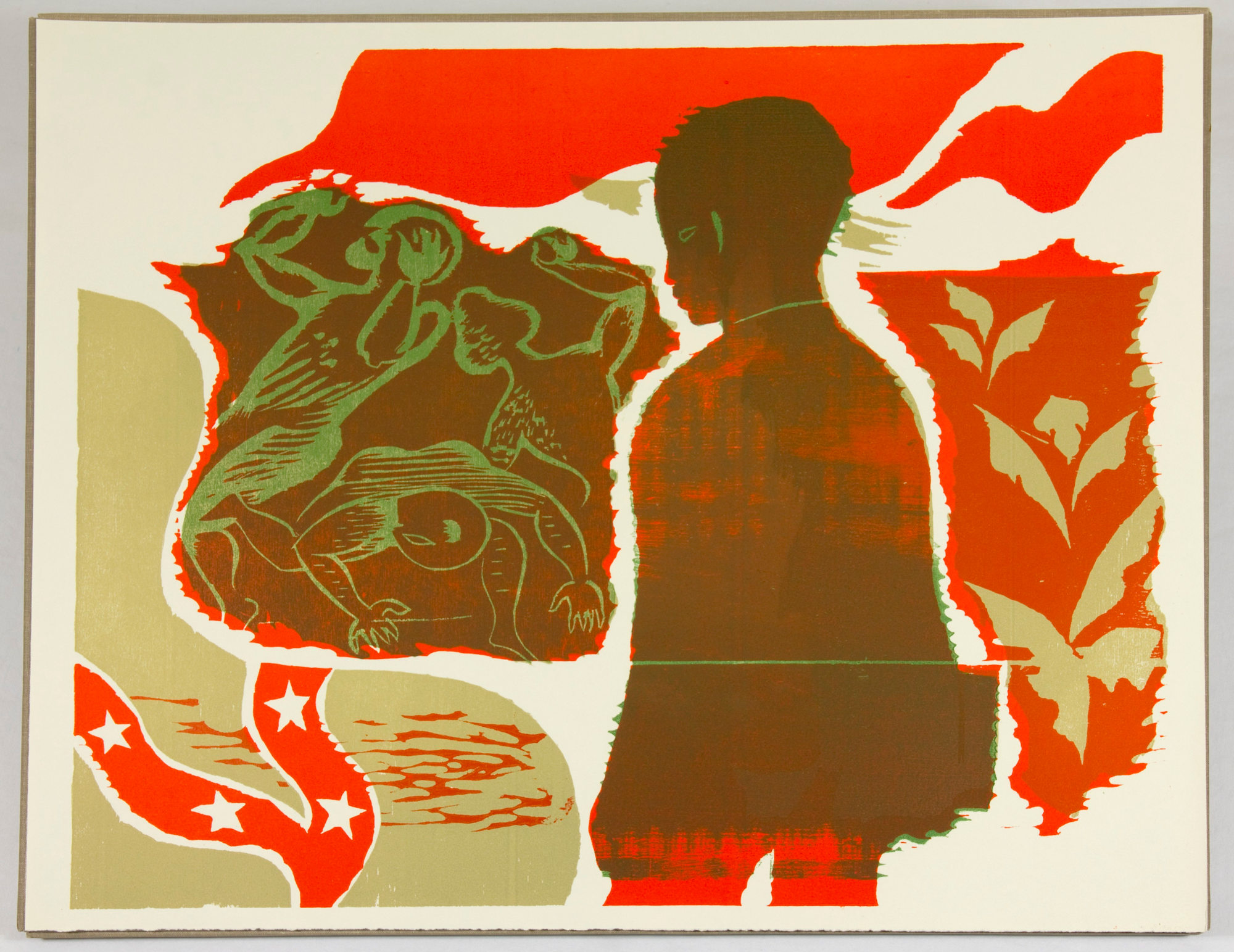 cream paper with an abstracted scene featuring a figure in the foreground with their back turned and looking towards a grouping of three figures in the background, with irregular shapes surrounding, and stripes containing four stars in the lower right; print in red, green, and brown ink